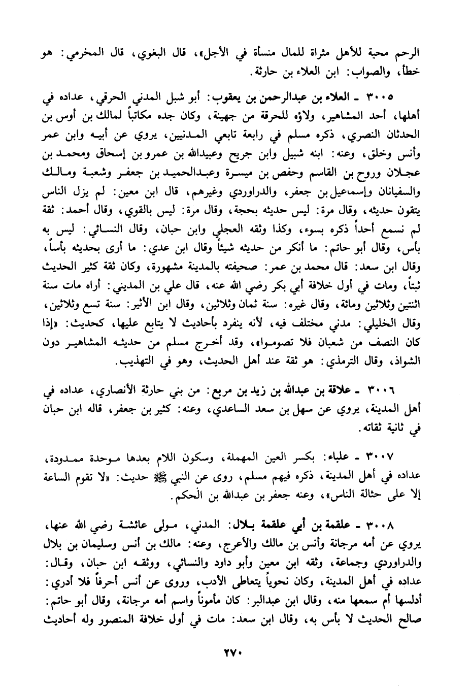 3005 - العلاء بن عبد الرحمن بن يعقوب: أبو شبل المدني الحرقي عداده في أهلها أحد المشاهير ولاؤه للحرقة من جهينة وكان جده مكاتبا لمالك بن أوس بن الحدثان النصري ذكره مسلم في رابعة تابعي المدنيين يروي عن أبيه وابن عمر وأنس وخلق وعنه: ابنه شبيل وابن جريج وعبيد الله بن عمرو بن إسحاق ومحمد بن عجلان وروح بن القاسم وحفص بن ميسرة وعبد الحميد بن جعفر وشعبة ومالك والسفيانان وإسماعيل بن جعفر والدراوردي وغيرهم قال ابن معين: لم يزل الناس يتقون حديثه وقال مرة: ليس حديثه بحجة وقال مرة: ليس بالقوي وقال أحمد: ثقة لم نسمع أحدا ذكره بسوء وكذا وثقه العجلي وابن حبان وقال النسائي: ليس به بأس وقال أبو حاتم: ما أنكر من حديثه شيئا وقال ابن عدي: ما أرى بحديثه بأسا وقال ابن سعد: قال محمد بن عمر: صحيفته بالمدينة مشهورة وكان ثقة كثير الحديث ثبتا ومات في أول خلافة أبي بكر رضي الله عنه قال علي بن المديني: أراه مات سنة اثنتين وثلاثين ومائة وقال غيره: سنة ثمان وثلاثين وقال ابن الأثير: سنة تسع وثلاثين وقال الخليلي: مدني مختلف فيه لأنه ينفرد بأحاديث لا يتابع عليها كحديث: "إذا كان النصف من شعبان فلا تصوموا" وقد أخرج مسلم من حديثه المشاهير دون الشواذ وقال الترمذي: هو ثقة عند أهل الحديث وهو في التهذيب.