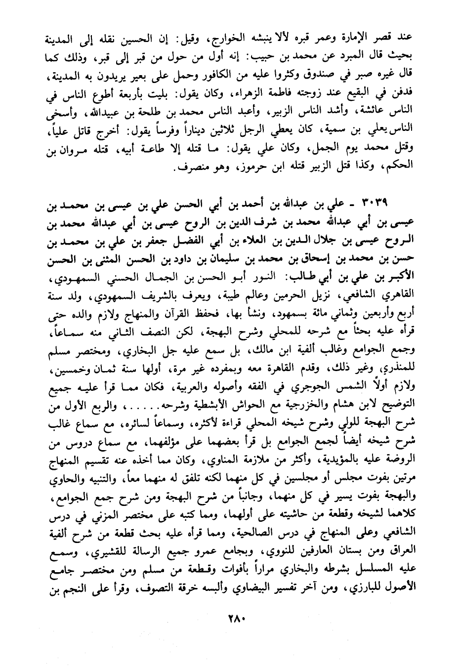 3039 - علي بن عبد الله بن أحمد بن أبي الحسن علي بن عيسى بن محمد بن عيسى بن أبي عبد الله محمد بن شرف الدين بن الروح عيسى بن أبي عبد الله محمد بن الروح عيسى بن جلال الدين بن العلاء بن أبي الفضل جعفر بن علي بن محمد بن حسن بن محمد بن إسحاق بن محمد بن سليمان بن داود بن الحسن المثنى بن الحسن الأكبر بن علي بن أبي طالب: النور أبو الحسن بن الجمال الحسني السمهودي القاهري الشافعي نزيل الحرمين وعالم طيبة ويعرف بالشريف السمهودي ولد سنة أربع وأربعين وثماني مائة بسمهود ونشأ بها فحفظ القرآن والمنهاج ولازم والده حتى قرأه عليه بحثا مع شرحه للمحلي وشرح البهجة لكن النصف الثاني منه سماعا وجمع الجوامع وغالب ألفية ابن مالك بل سمع عليه جل البخاري ومختصر مسلم للمنذري وغير ذلك وقدم القاهرة معه وبمفرده غير مرة أولها سنة ثمان وخمسين ولازم أولا الشمس الجوجري في الفقه وأصوله والعربية فكان مما قرأ عليه جميع التوضيح لابن هشام والخزرجية مع الحواش الأبشطية وشرحه والربع الأول من شرح البهجة للولي وشرح شيخه المحلي قراءة لأكثره وسماعا لسائره مع سماع غالب شرح شيخه أيضا لجمع الجوامع بل قرأ بعضهما على مؤلفهما مع سماع دروس من الروضة عليه بالمؤيدية وأكثر من ملازمة المناوي وكان مما أخذه عنه تقسيم المنهاج مرتين بفوت مجلس أو مجلسين في كل منهما لكنه تلفق له منهما معا والتنبيه والحاوي والبهجة بفوت يسير في كل منهما وجانبا من شرح البهجة ومن شرح جمع الجوامع كلاهما لشيخه وقطعة من حاشيته على أولهما ومما كتبه على مختصر المزني في درس الشافعي وعلى المنهاج في درس الصالحية ومما قرأه عليه بحث قطعة من شرح ألفية العراق ومن بستان العارفين للنووي وبجامع عمرو جميع الرسالة للقشيري وسمع عليه المسلسل بشرطه والبخاري مرارا بأفوات وقطعة من مسلم ومن مختصر جامع الأصول للبارزي ومن آخر تفسير البيضاوي وألبسه خرقة التصوف وقرأ على النجم بن