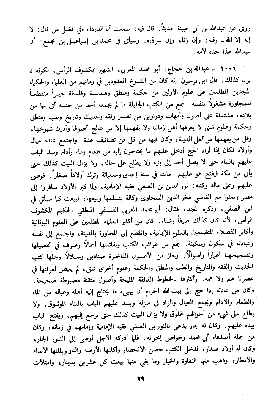 2006 - عبد الله بن حجاج: أبو محمد المغربي, الشهير بمكشوف الرأس, لكونه لم يزل كذلك. قال ابن فرحون إنه كان من الشيوخ المعدودين في زمانهم من العلماء والحكماء المجدين المطلعين على علوم الأولين من حكمة ومنطق وهندسة وفلسفة خيرا منقطعا للمجاورة مشغولا بنفسه. جمع من الكتب الجليلة ما لم يجمعه أحد من جنسه أتى بها من بلاده, مشتملة على أصول وأمهات ودواوين من تفسير وفقه وحديث وتاريخ وطب ومنطق وحكمة وعلوم شتى لا يعرفها أهل زماننا ولا يفهمها إلا من عالج أصولها وأدرك شيوخها, وقل من يفهمها من أهل المدينة, وكان فيها من كل فن تصانيف عدة. واجتمع عنده عيال وأولاد فكان إذا أراد الحج أدخل عليهم ما يحتاجون إليه من طعام وماء وأدام وسد الباب عليهم بالبناء حتى لا يصل أحد إلى بنيه ولا يطلع على حاله ولا يزال البيت كذلك حتى يأتي من مكة فيفتح هو عليهم. مات في سنة إحدى وسبعمائة وترك أولادا صغارا. فوصى عليهم وعلى ماله وكتبه: نور الدين بن الصفي فقيه الإمامية, ولما كبر الأولاد سافروا إلى مصر وبعثوا مع القاضي فخر الدين السخاوي وكالة بتسلمها وبيعها, فبيعت كما سيأتي في ابن الصفي, وذكره المجد, فقال: أبو محمد المغربي الفلسفي المنطقي الحكيم المكشوف الرأس, لأنه كان كذلك صيفا وشتاء. كان من أكابر العلماء المطلعين على العلوم اليونانية وأكابر الفضلاء المتضلعين بالعلوم الإيمانية, وانقطع إلى المجاورة بالمدينة واجتمع إلى نفسه وعبادته في سكون وسكينة. جمع من غرائب الكتب ونفائسها أحمالا وصرف في تحصيلها وتصحيحها أعمارا وأموالا. وحاز من الأصول الفاخرة صناديق وسلالا وجلها كتب الحديث والفقه والتاريخ والطب والمنطق والحكمة وعلوم أخرى شتى لم ينهض لمعرفتها في عصرنا هم ولا همة. وأكثرها بالخطوط الفائقة المليحة وأصول متقنة مضبوطة صحيحة, وكان من عادته إذا حج إلى بيت الله الحرام أن يهيىء ما يحتاج إليه أهله وعياله من الماء والطعام والادام ويجمع العيال والزاد في منزله ويسد عليهم الباب بالبناء الموثوق. ولا يطلع على شيء من أحوالهم مخلوق ولا يزال البيت كذلك حتى يرجع إليهم ويفتح الباب بيده عليهم. وكان له جار يدعى بالنور بن الصفي فقيه الإمامية وإمامهم في زمانه وكان من جملة أصدقاء أبي محمد وخواص إخوانه فلما أدركه الأجل أوصى إلى النور الجار وكان له أولاد صغار فدخل الكتب حصن الانحصار وأكلتها الأرضة والنار وبللتها الأنداد والأمطار وذهب منها النقاوة والخيار وما بقي منها بيعت كل عشرين بدينار وامتلأت