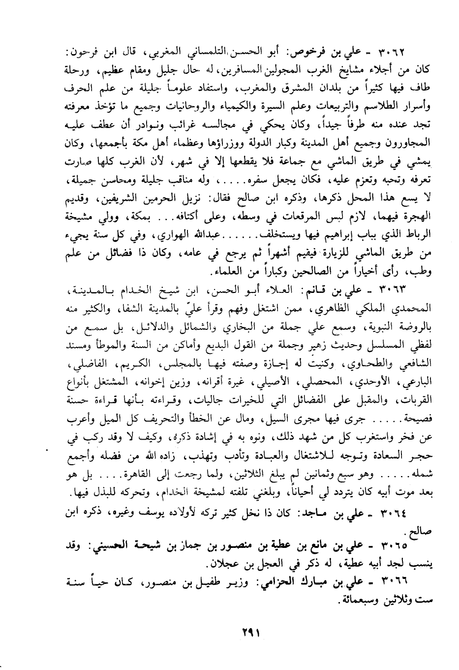 3062 - علي بن فرخوص: أبو الحسن التلمساني المغربي قال ابن فرحون: كان من أجلاء مشايخ الغرب المجولين المسافرين له حال جليل ومقام عظيم ورحلة طاف فيها كثيرا من بلدان المشرق والمغرب واستفاد علوما جليلة من علم الحرف وأسرار الطلاسم والتربيعات وعلم السيرة والكيمياء والروحانيات وجميع ما تؤخذ معرفته تجد عنده منه طرفا جيدا وكان يحكي في مجالسه غرائب ونوادر أن عطف عليه المجاورون وجميع أهل المدينة وكبار الدولة ووزراؤها وعظماء أهل مكة بأجمعها وكان يمشي في طريق الماشي مع جماعة فلا يقطعها إلا في شهر لأن الغرب كلها صارت تعرفه وتحبه وتعزم عليه فكان يجعل سفره وله مناقب جليلة ومحاسن جميلة لا يسع هذا المحل ذكرها وذكره ابن صالح فقال نزيل الحرمين الشريفين وقديم الهجرة فيهما لازم لبس المرقعات في وسطه وعلى أكتافه بمكة وولي مشيخة الرباط الذي بباب إبراهيم فيها ويستخلف عبد الله الهواري وفي كل سنة يجيء من طريق الماشي للزيارة فيقيم أشهرا ثم يرجع في عامة وكان ذا فضائل من علم وطب رأى أخيارا من الصالحين وكبارا من العلماء.