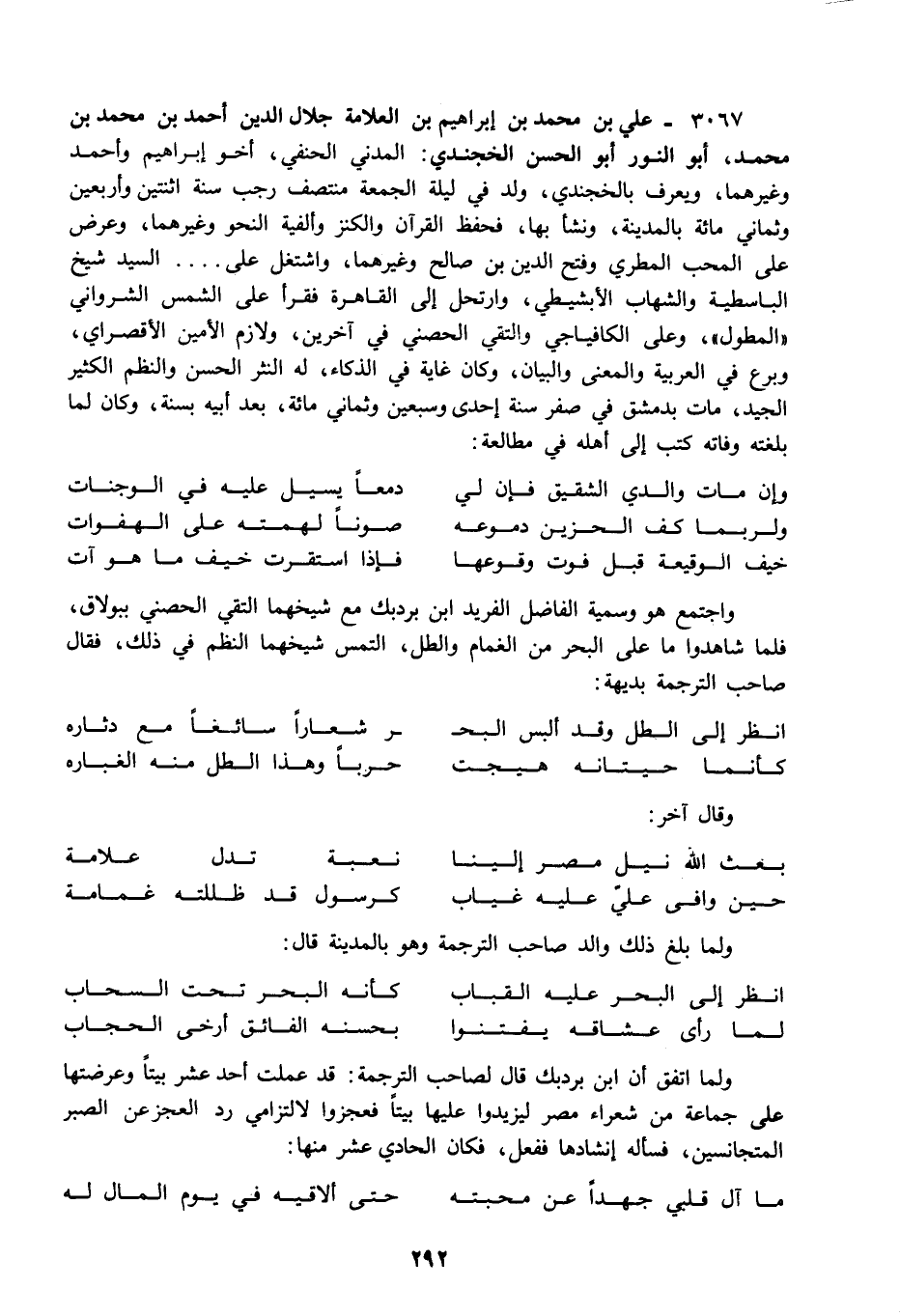 3067 - علي بن محمد بن إبراهيم بن العلامة جلال الدين أحمد بن محمد بن محمد أبو النور أبو الحسن الخجندي: المدني الحنفي أخو إبراهيم وأحمد وغيرهما ويعرف بالخجندي ولد في ليلة الجمعة منتصف رجب سنة اثنتين وأربعين وثماني مائة بالمدينة ونشأ بها فحفظ القرآن والكنز وألفية النحو وغيرهما وعرض على المحب المطري وفتح الدين بن صالح وغيرهما واشتغل على السيد شيخ الباسطية والشهاب الأبشيطي وارتحل إلى القاهرة فقرأ على الشمس الشرواني المطول وعلى الكافياجي والتقي الحصني في آخرين ولازم الأمين الأقصراي وبرع في العربية والمعنى والبيان وكان غاية في الذكاء له النثر الحسن والنظم الكثير الجيد مات بدمشق في صفر سنة إحدى وسبعين وثماني مائة بعد أبيه بسنة وكان لما بلغته وفاته كتب إلى أهله في مطالعة:
