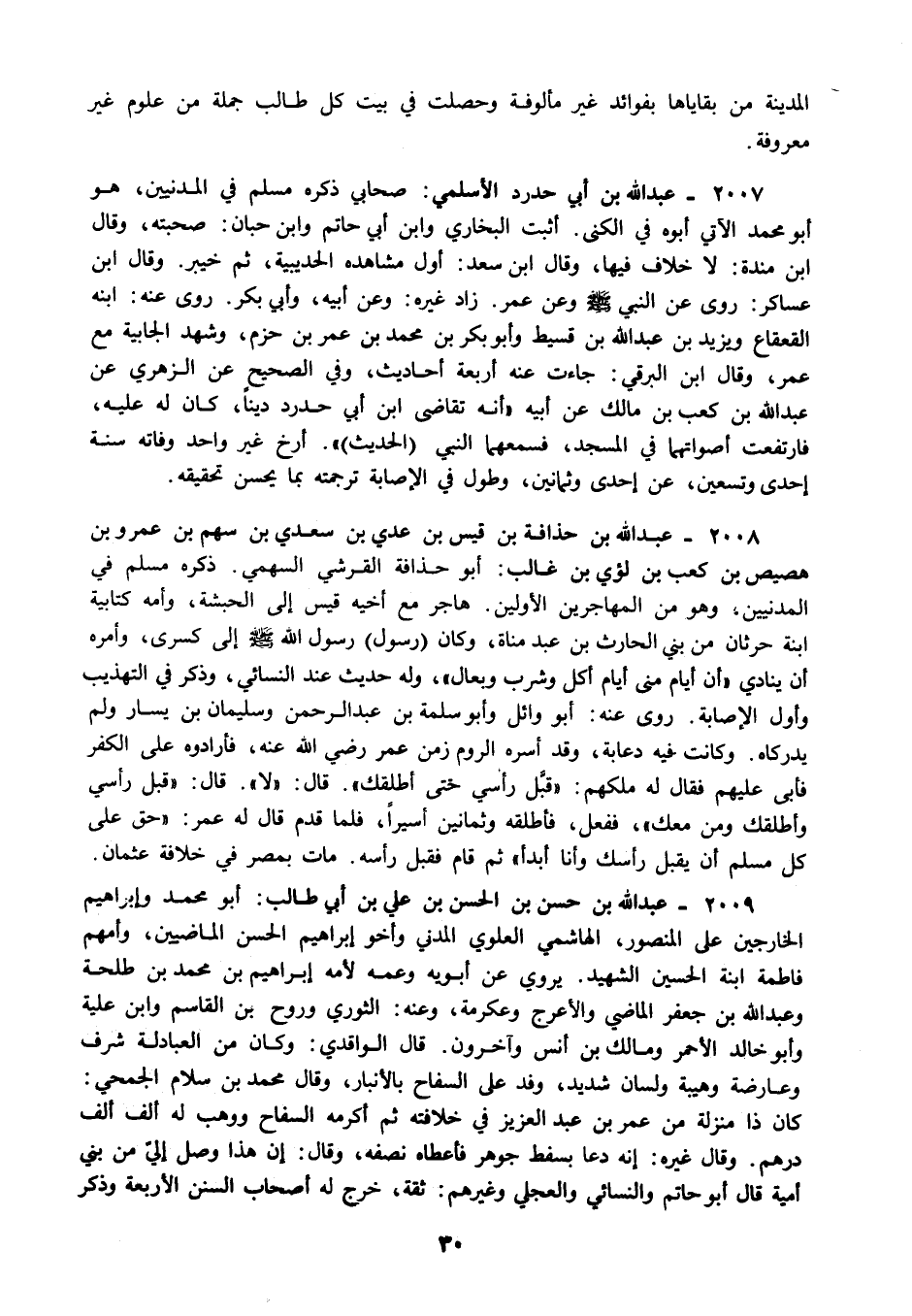 2007 - عبد الله بن أبي حدرد الأسلمي: صحابي ذكره مسلم في المدنيين هو أبو محمد الآتي أبوه في الكنى. أثبت البخاري وابن أبي حاتم وابن حبان: صحبته وقال ابن مندة: لا خلاف فيها وقال ابن سعد: أول مشاهده الحديبية ثم خيبر وقال ابن عساكر: روى عن النبي صلى الله عليه وسلم وعن عمر زاد غيره: وعن أبيه وأبي بكر روى عنه ابنه القعقاع ويزيد بن عبد الله بن قسيط وأبو بكر بن محمد بن عمر بن حزم وشهد الجابية مع عمر وقال ابن البرقي جاءت عنه أربعة أحاديث وفي الصحيح عن الزهري عن عبد الله بن كعب بن مالك عن أبيه "أنه تقاضى ابن أبي حدرد دينا كان له عليه فارتفعت أصواتهما في المسجد فسمعهما النبي صلى الله عليه وسلم الحديث" أرخ غير واحد وفاته سنة إحدى وتسعين عن إحدى وثمانين وطول في الإصابة ترجمته بما يحسن تحقيقه.