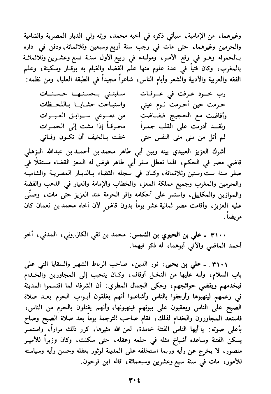 3101 - علي بن يحيى: نور الدين صاحب الرباط الشهير والسقايا التي على باب السلام وله عليها من النخل أوقاف وكان يتحبب إلى المجاورين والخدام فيخدمهم ويقضي حوائجهم وحكى الجمال المطري: أن الشرفاء لما اقتسموا المدينة في زعمهم لينهبوها وأرجفوا بالناس وأشاعوا أنهم يغلقون أبواب الحرم بعد صلاة الصبح على الناس ويعقبون على بيوتهم فينهبونها وأنهم يقتلون بالحرم من الناس فاستعد المجاورون والخدام لذلك فقام صاحب الترجمة يوما بعد صلاة الصبح وصاح بأعلى صوته: يا أيها الناس الفتنة خامدة لعن الله مثيرها كرر ذلك مرارا واستمر يسكن الفتنة وساعده أشياخ مثله في حلمه وعقله حت سكنت وكان وزيرا للأمير منصور لا يخرج عن رأيه وربما استخلفه على المدينة لوثور بعقله وحسن رأيه وسياسته للأمور مات في سنة سبع وعشرين وسبعمائة قاله ابن فرحون.