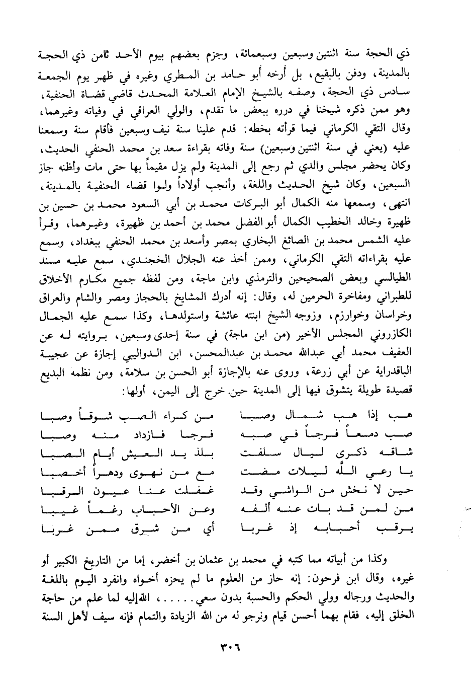 وكذا من أبياته مما كتبه في محمد بن عثمان بن أخضر إما من التاريخ الكبير أو غيره وقال ابن فرحون: إنه حاز من العلوم ما لم يحزه أخواه وانفرد اليوم باللغة والحديث ورجاله وولي الحكم والحسبة بدون سعي الله إليه لما علم من حاجة الخلق إليه فقام بهما أحسن قيام ونرجو له من الله الزيادة والتمام فإنه سيف لأهل السنة
