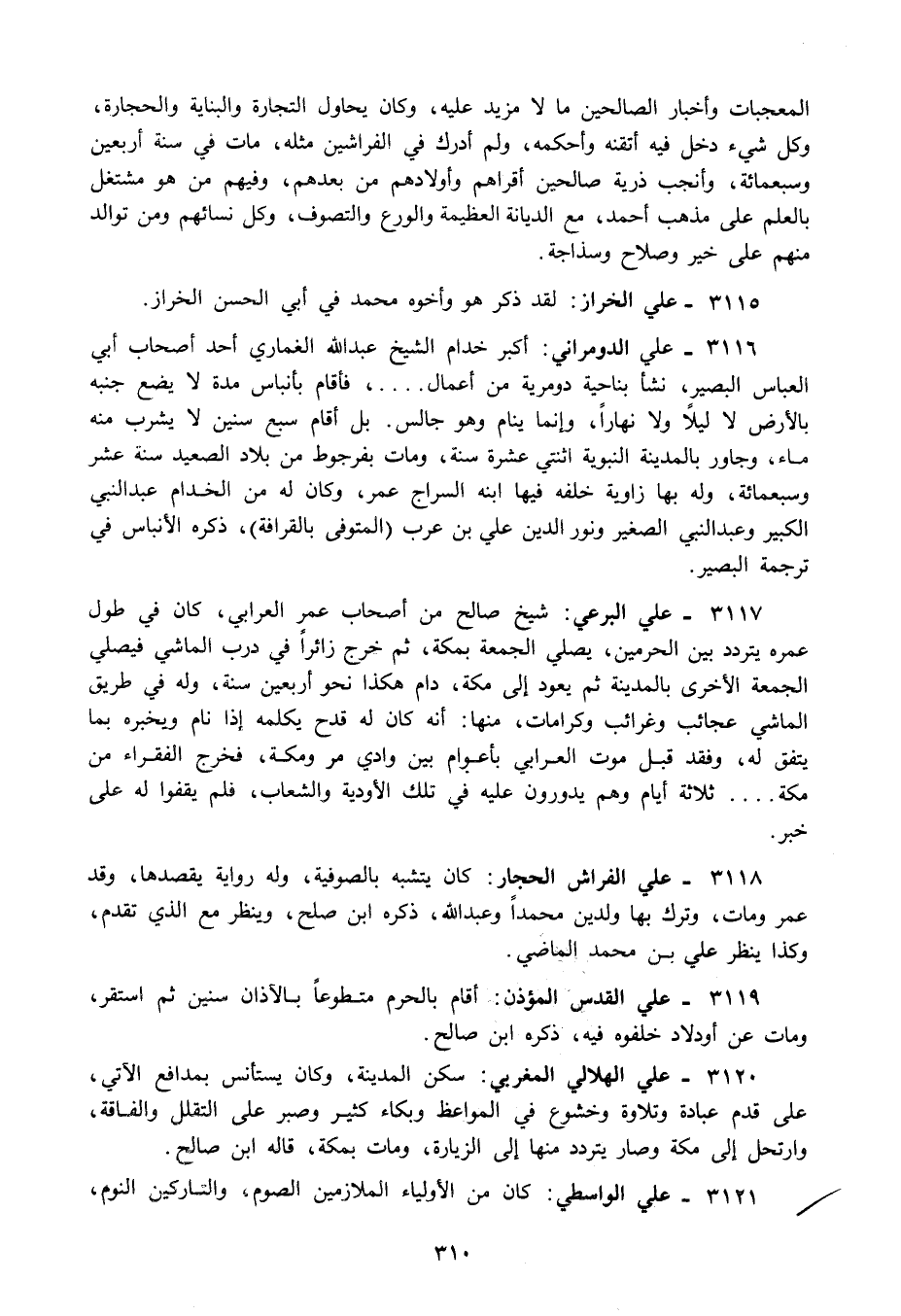 3118 - علي الفراش الحجار: كان يتشبه بالصوفية وله رواية يقصدها وقد عمر ومات وترك بها ولدين محمدا وعبد الله ذكره ابن صلح وينظر مع الذي تقدم وكذا ينظر علي بن محمد الماضي.