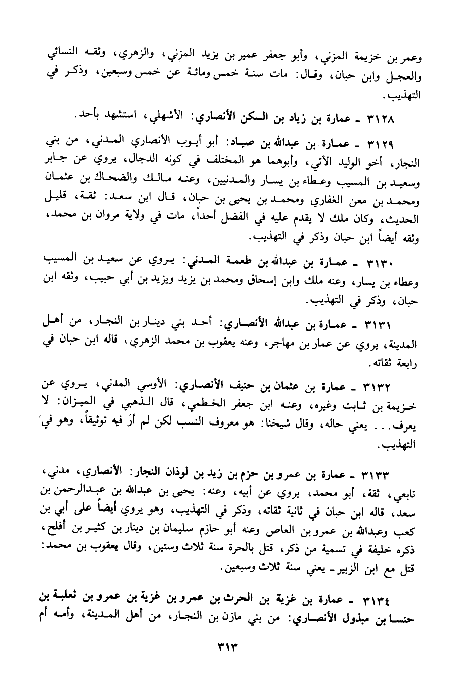 3132 - عمارة بن عثمان بن حنيف الأنصاري: الأوسي المدني يروي عن خزيمة بن ثابت وغيره وعنه ابن جعفر الخطمي قال الذهبي في الميزان: لا يعرف يعني حاله وقال شيخنا: هو معروف النسب لكن لم أر فيه توثيقا وهو في التهذيب.