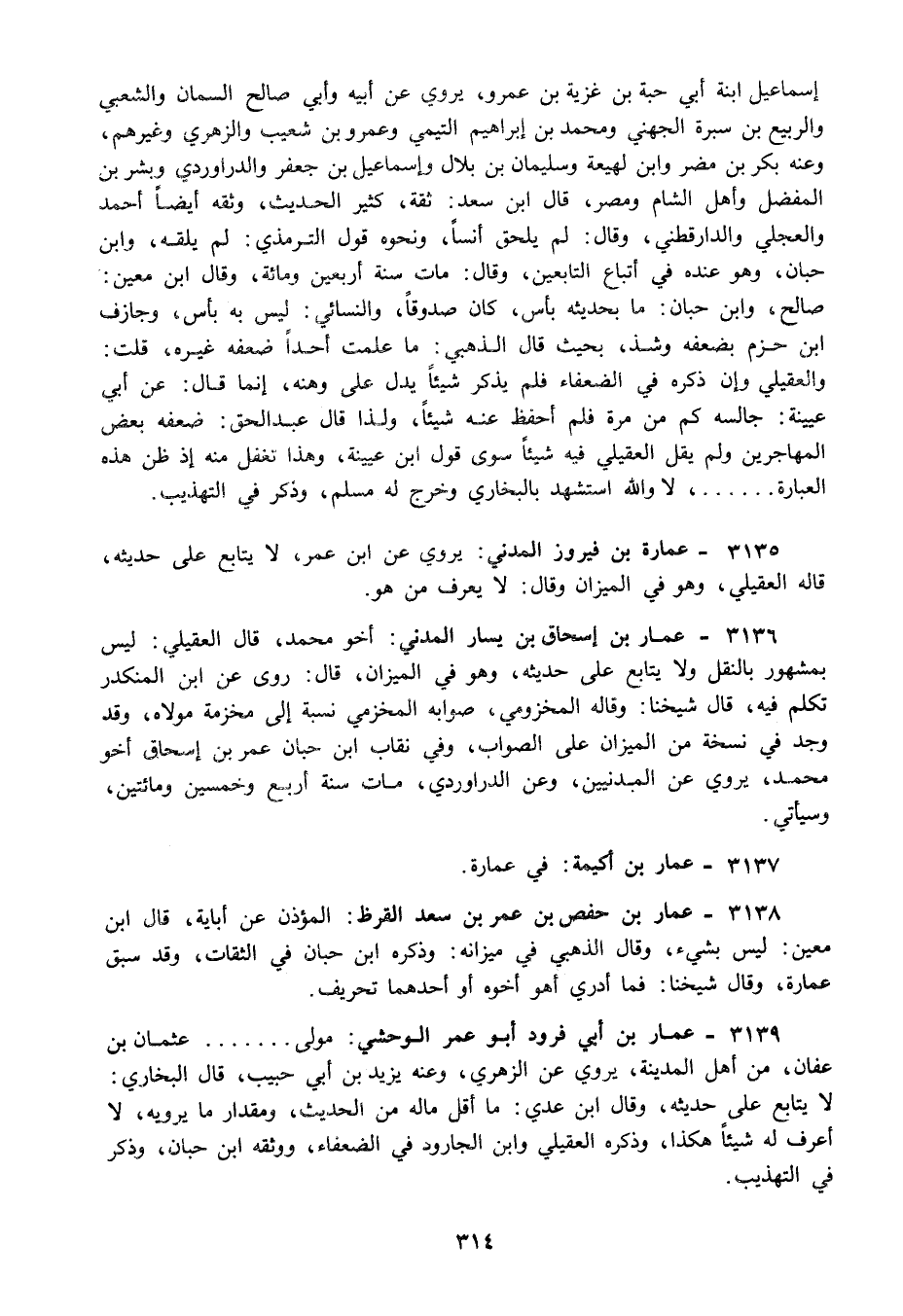 3136 - عمار بن إسحاق بن يسار المدني: أخو محمد قال العقيلي: ليس بمشهور بالنقل ولا يتابع على حديثه وهو في الميزان قال: روى عن ابن المنكدر تكلم فيه قال شيخنا: وقاله المخزومي صوابه المخزمي نسبة إلى مخزمة مولاه وقد وجد في نسخة من الميزان على الصواب وفي نقاب ابن حبان عمر بن إسحاق أخو محمد يروي عن المدنيين وعن الدراوردي مات سنة أربع وخمسين ومائتين وسيأتي.