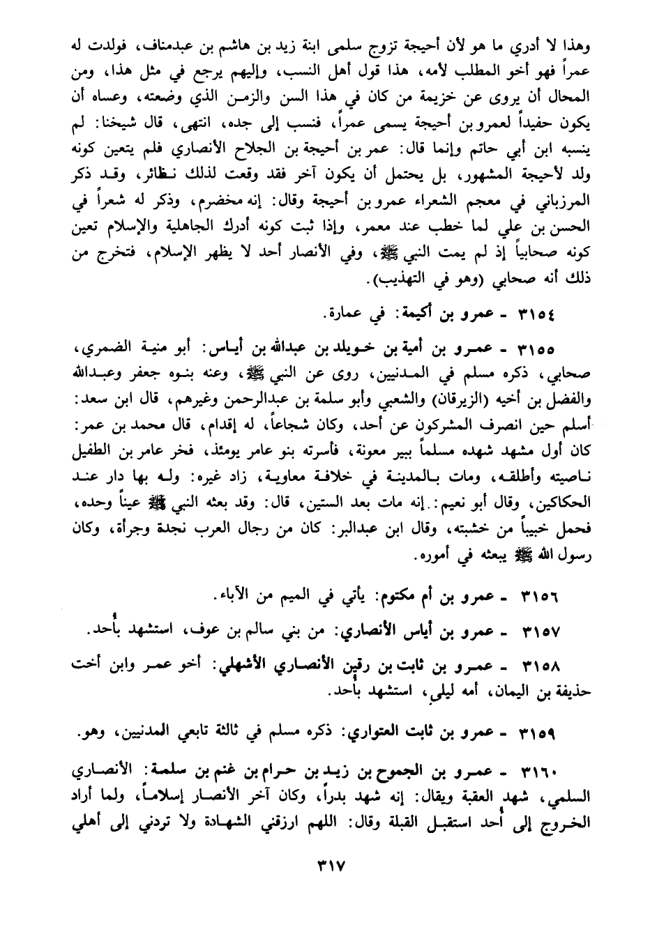 3158 - عمرو بن ثابت بن رقين الأنصاري الأشهلي: أخو عمر وابن أخت حذيفة بن اليمان أمه ليلى استشهد بأحد.