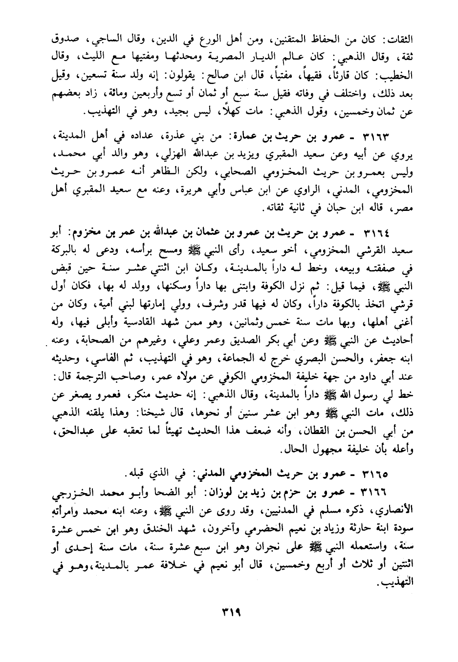 3163 - عمرو بن حريث بن عمارة: من بني عذرة عداده في أهل المدينة يروي عن أبيه وعن سعيد المقبري ويزيد بن عبد الله الهزلي وهو والد أبي محمد وليس بعمرو بن حريث المخزومي الصحابي ولكن الظاهر أنه عمرو بن حريث المخزومي المدني الراوي عن ابن عباس وأبي هريرة وعنه مع سعيد المقبري أهل مصر قاله ابن حبان في ثانية ثقاته.