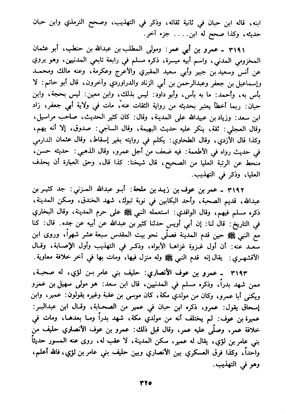 3193 - عمرو بن عوف الأنصاري: حليف بني عامر بن لؤي له صحبة ممن شهد بدرا وذكره مسلم في المدنيين قال ابن سعد: هو مولى سهيل بن عمرو ويكنى أبا عمرو وكان من مولدي مكة كان موسى بن عقبة وغيره يقولون: عمير وابن اسحاق يقول: عمرو ذكره ابن حبان في عمير من الصحابة وقال ابن عبد البر: عميرة بن عوف: لم يختلف أنه من مولدي مكة شهد بدرا وما بعدها ومات في خلافة عمر وصلى عليه عمر وقال قبل ذلك: عمرو بن عوف الأنصاري حليف من بني عامر بن لؤي يقال له عمير سكن المدينة لا عقب له روى عنه المسور حديثا واحدا وكذا فرق العسكري بين الأنصاري وبين حليف بني عامر بن لؤي فالله أعلم وهو في التهذيب.