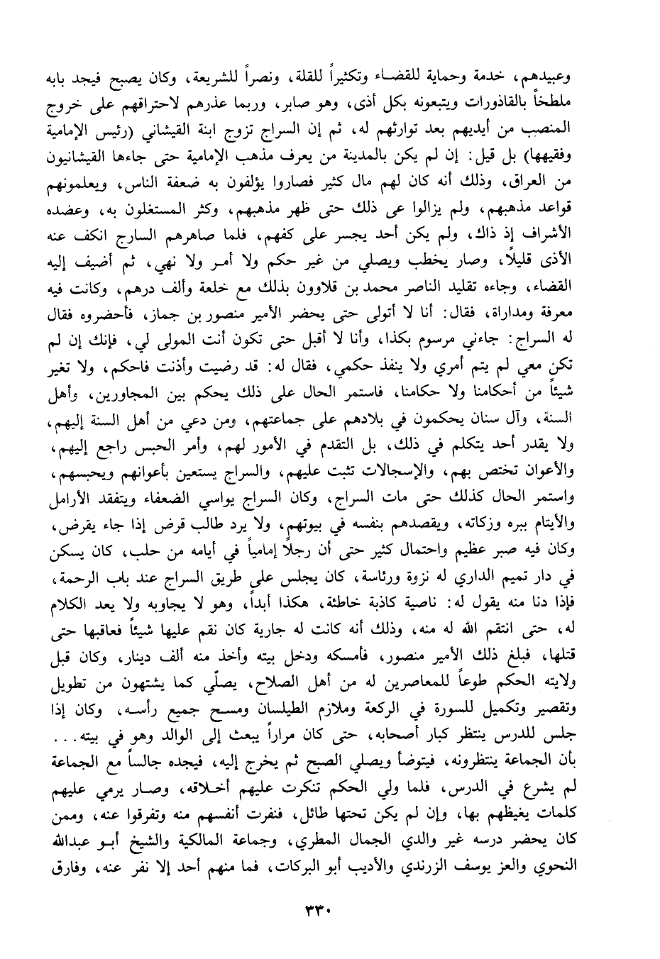 وعبيدهم خدمة وحماية للقضاء وتكثيرا للقلة ونصرا للشريعة وكان يصبح فيجد بابه ملطخا بالقاذورات ويتبعونه بكل أذى وهو صابر وربما عذرهم لاحتراقهم على خروج المنصب من أيديهم بعد توارثهم له ثم إن السراج تزوج ابنة القيشاني "رئيس الإمامية وفقيهها" بل قيل: إن لم يكن بالمدينة من يعرف مذهب الإمامية حتى جاءها القيشانيون من العراق وذلك أنه كان لهم مال كثير فصاروا يؤلفون به ضعفة الناس ويعلمونهم قواعد مذهبهم ولم يزالوا على ذلك حتى ظهر مذهبهم وكثر المستغلون به وعضده الأشراف إذ ذاك ولم يكن أحد يجسر على كفهم فلما صاهرهم السارج انكف عنه الأذى قليلا وصار يخطب ويصلي من غير حكم ولا أمر ولا نهي ثم أضيف إليه القضاء وجاءه تقليد الناصر محمد بن قلاوون بذلك مع مع خلعة وألف درهم وكانت فيه معرفة ومداراة فقال: انا لا أتولى حتى يحضر الأمير منصور بن جماز فأحضروه فقال له السراج: جاءني مرسوم بكذا وأنا لا أقبل حتى تكون أنت المولى لي فإنك إن لم تكن معي لم يتم أمري ولا ينفذ حكمي فقال له: قد رضيت وأذنت فأحكم ولا تغير شيئا من أحكامنا ولا حكامنا فاستمر الحال على ذلك يحكم بين المجاورين وأهل السنة وآل سنان يحكمون في بلادهم على جماعتهم ومن دعي من أهل السنة إليهم ولا يقدر أحد يتكلم في ذلك بل التقدم في الأمور لهم وأمر الحبس راجع إليهم والأعوان تختص بهم والإسجالات تثبت عليهم والسراج يستعين بأعوانهم ويحبسهم واستمر الحال كذلك حتى مات السراج وكان السراج يواسي الضعفاء ويتفقذ الأرامل والأيتام ببره وزكاته ويقصدهم بنفسه في بيوتهم ولا يرد طالب قرض إذا جاء يقرض وكان فيه صبر عظيم واحتمال كثير حتى أن رجلا إماميا في أيامه من حلب كان يسكن في دار تميم الداري له نزوة ورئاسة كان يجلس على طريق السارج عند باب الرحمة فإذا دنا منه يقول له: ناصية كاذبة خاطئة هكذا أبدا وهو لا يجاوبه ولا يعد الكلام له حتى انتقم الله له منه وذلك أنه كانت له جارية كان نقم عليها شيئا فعاقبها حتى قتلها فبلغ ذلك الأمير منصور فأمسكه ودخل بيته وأخذ منه ألف دينار وكان قبل ولايته الحكم طوعا للمعاصرين له من أهل الصلاح يصلي كما يشتهون من تطويل وتقصير وتكميل للسورة في الركعة وملازم الطيلسان ومسح جميع رأسه وكان إذا جلس للدرس ينتظر كبار أصحابه حتى كان مرارا يبعث إلى الوالد وهو في بيته بأن الجماعة ينتظرونه فيتوضأ ويصلي الصبح ثم يخرج إليه فيجده جالسا مع الجماعة لم يشرع في الدرس فلما ولي الحكم تنكرت عليهم أخلاقه وصار يرمي عليهم كلمات يغيظهم بها وإن لم يكن تحتها طائل فنفرت أنفسهم منه وتفرقوا عنه وممن كان يحضر درسه غير والدي الجمال المطري وجماعة المالكية والشيخ أبو عبد الله النحوي والعز يوسف الزرندي والأديب أبو البركات فما منهم أحد إلا نفر عنه وفارق