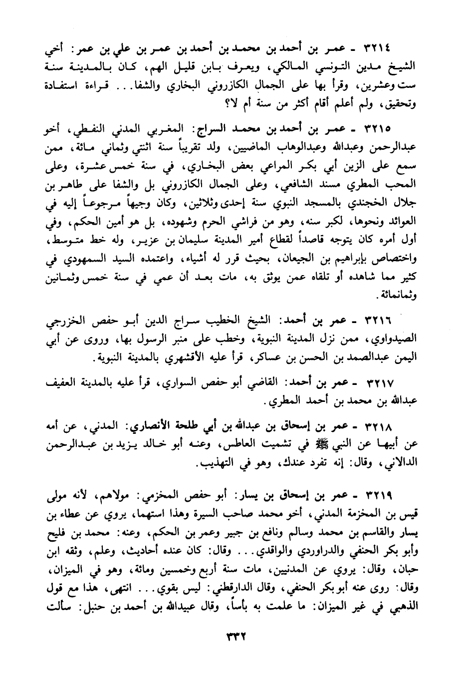 3216 - عمر بن أحمد: الشيخ الخطيب سراج الدين أبو حفص الخزرجي الصيدواوي ممن نزل المدينة النبوية وخطب على منبر الرسول بها وروى عن أبي اليمن عبد الصمد بن الحسن بن عساكر قرأ عليه الأقشهري بالمدينة النبوية.