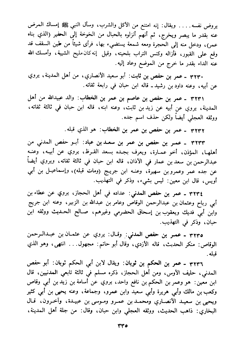 3231 - عمر بن حفص بن عاصم بن عمر بن الخطاب: والد عبيد الله من أهل المدينة يروي عن أبيه عن زيد بن ثابت وعنه ابنه قاله ابن حبان في ثالثة ثقاته ووثقه العجلي ايضا ولكن حذف اسم جده.