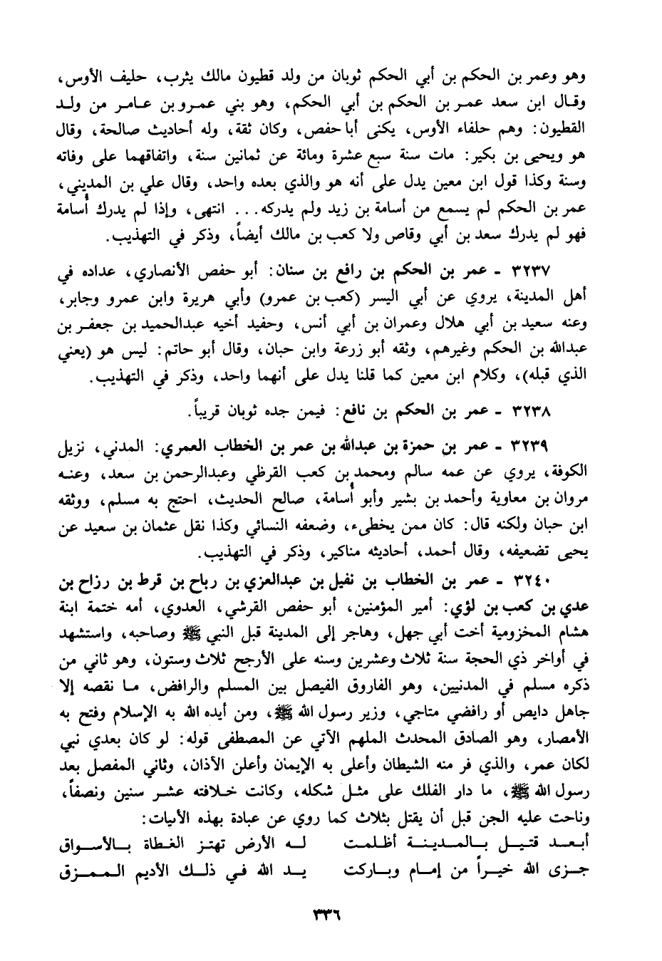 3237 – عمر بن الحكم بن رافع بن سنان: أبو حفص الأنصاري عداده في أهل المدينة يروي عن أبي اليسر "كعب بن عمرو" وأبي هريرة وابن عمرو وجابر وعنه سعيد بن أبي هلال وعمران بن أبي أنس وحفيد أخيه عبد الحميد بن جعفر بن عبد الله بن الحكم وغيرهم وثقه أبو زرعة وابن حبان وقال أبو حاتم: ليس هو "يعني الذي قبله" وكلام ابن معين كما قلنا يدل على أنهما واحد وذكر في التهذيب.