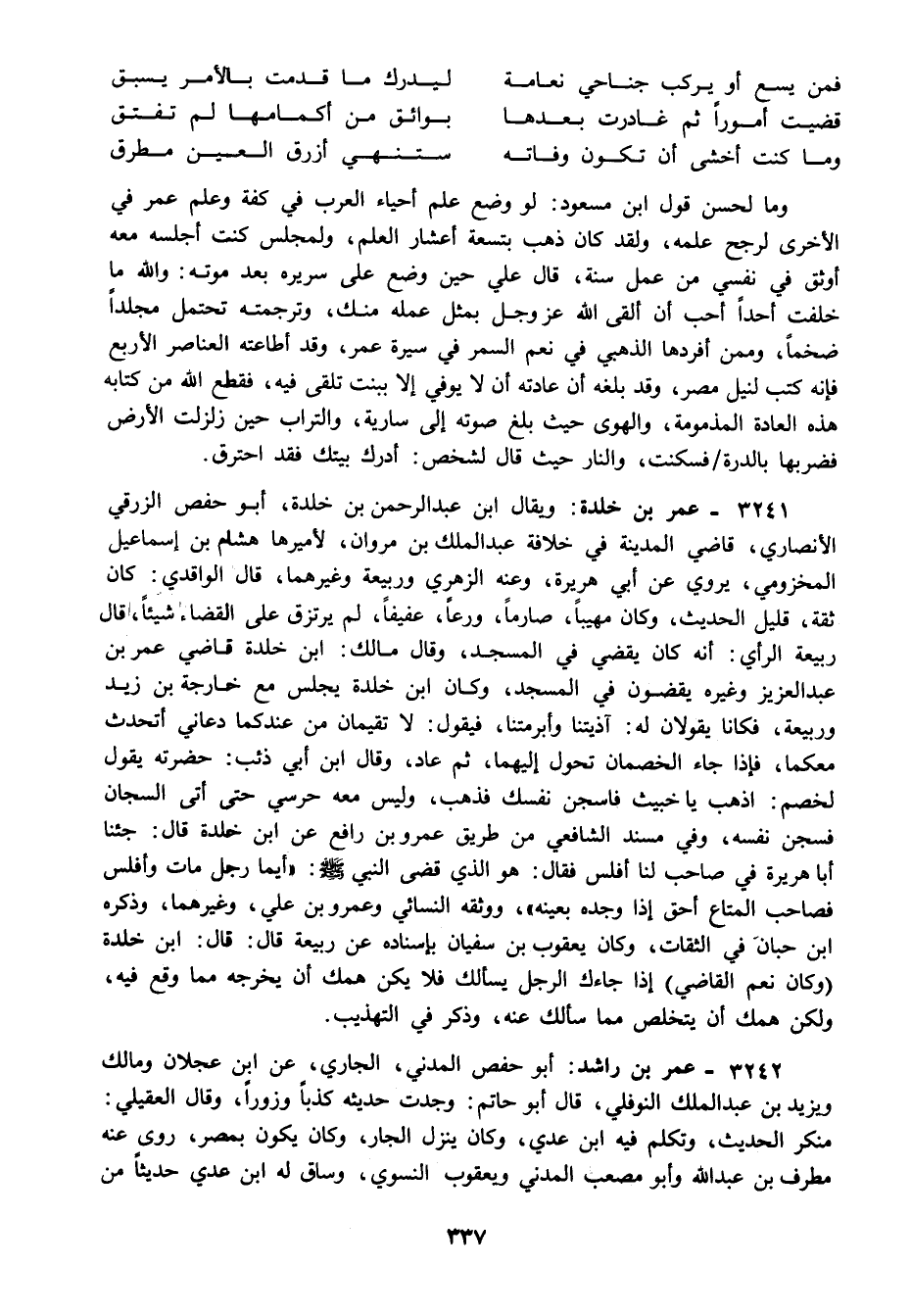 3241 - عمر بن خلدة: ويقال ابن عبد الرحمن بن خلدة أبو حفص الزرقي الأنصاري قاضي المدينة في خلافة عبد الملك بن مروان لأميرها هشام بن إسماعيل المخزومي يروي عن أبي هريرة وعنه الزهري وربيعة وغيرهما قال الواقدي: كان ثقة قليل الحديث وكان مهيبا صارما ورعا عفيفا لم يرتزق على القضاء شيئا قال ربيعة الرأي: أنه كان يقضي في المسجد وقال مالك: ابن خلدة قاضي عمر بن عبد العزيز وغيره يقضون في المسجد وكان ابن خلدة يجلس مع خارجة بن زيد وربيعة فكانا يقولان له آذيتنا وأبرمتنا فيقول: لا تقيمان من عندكما دعاني أتحدث معكما فإذا جاء الخصمان تحول إليهما ثم عاد وقال ابن أبي ذئب: حضرته يقول لخصم: اذهب يا خبيث فاسجن نفسك فذهب وليس معه حرسي حتى أتى السجان فسجن نفسه وفي مسند الشافعي من طريق عمرو بن رافع عن ابن خلدة قال: جئنا أبا هريرة في صاحب لنا أفلس فقال: هو الذي قضى النبي صلى الله عليه وسلم: "أيما رجل مات وأفلس فصاحب المتاع أحق إذا وجده بعينه" ووثقه النسائي وعمرو بن علي وغيرهما وذكره ابن حبان في الثقات وكان يعقوب بن سفيان بإسناده عن ربيعة قال: قال: ابن خلدة "وكان نعم القاضي" إذا جاءك الرجل يسألك فلا يكن همك أن يخرجه مما وقع فيه ولكن همك أن يتخلص مما سألك عنه وذكر في التهذيب.