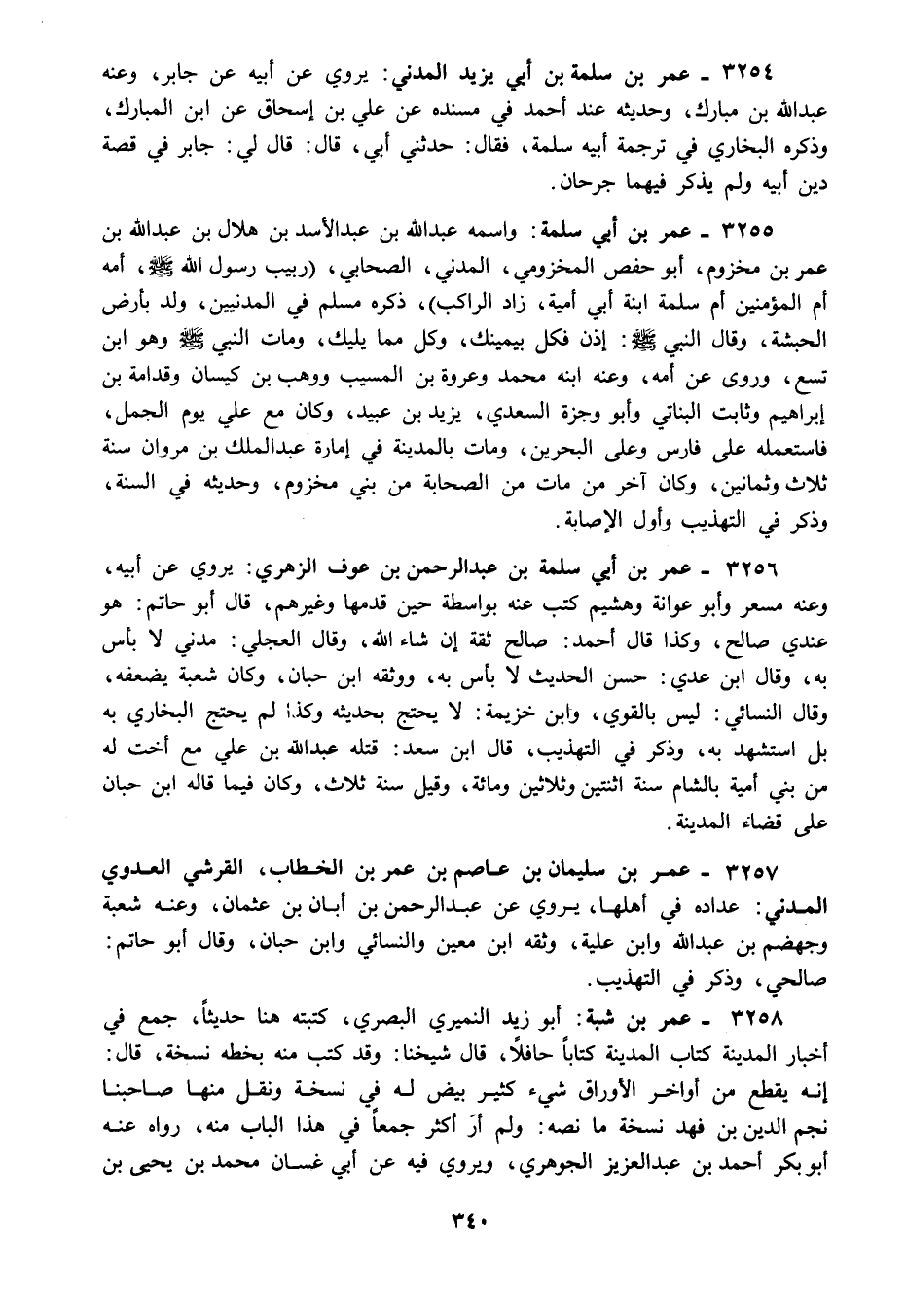 3254 - عمر بن سلمة بن أبي يزيد المدني: يروي عن أبيه عن جابر وعنه عبد الله بن مبارك وحديثه عند أحمد في مسنده عن علي بن إسحاق عن ابن المبارك وذكره البخاري في ترجمة أبيه سلمة فقال: حدثني أبي قال: قال لي: جابر في قصة دين أبيه ولم يذكر فيهما جرحان.
