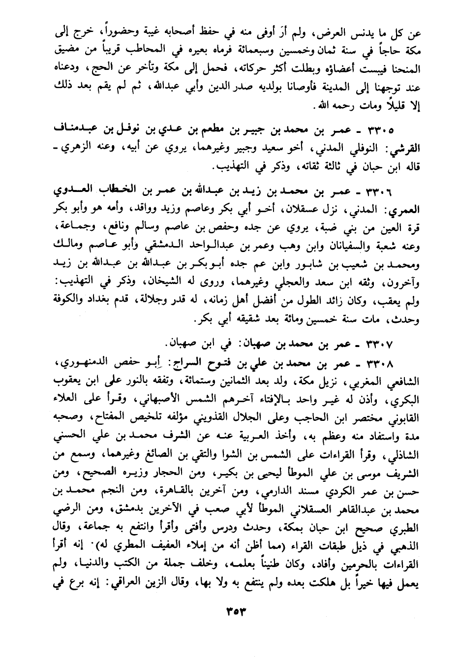 3308 - عمر بن محمد بن علي بن فتوح السراج: أبو حفص الدمنهوري الشافعي المغربي نزيل مكة ولد بعد الثمانين وستمائة وتفقه بالنور على ابن يعقوب البكري وأذن له غير واحد بالإفتاء آخرهم الشمس الأصبهاني وقرأ على العلاء القابوني مختصر ابن الحاجب وعلى الجلال القذويني مؤلفه تلخيص المفتاح وصحبه مدة واستفاد منه وعظم به وأخذ العربية عنه عن الشرف محمد بن علي الحسني الشاذلي وقرأ القراءات على الشمس بن الشوا والتقي بن الصائغ وغيرهما وسمع من الشريف موسى بن علي الموطأ ليحي بن بكير ومن الحجار وزيره الصحيح ومن حسن بن عمر الكردي مسند الدارمي ومن آخرين بالقاهرة ومن النجم محمد بن محمد بن عبد القاهر العسقلاني الموطأ لأبي صعب في الآخرين بدمشق ومن الرضي الطبري صحيح ابن حبان بمكة وحدث ودرس وأفتى وأقرأ وانتفع به جماعة وقال الذهبي في ذيل طبقات القراء "مما أظن أنه من إملاء العفيف المطري له" إنه أقرأ القراءات بالحرمين وأفاد وكان طنينا بعلمه وخلف جملة من الكتب والدنيا ولم يعمل فيها خيرا بل هلكت بعده ولم ينتفع به ولا بها وقال الزين العراقي: إنه برع في