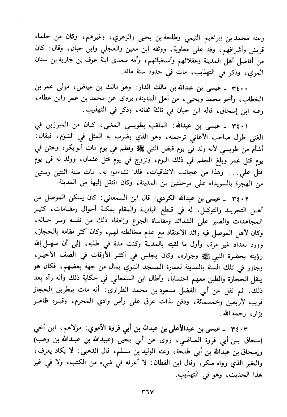 3400 - عيسى بن عبد الله بن مالك الدار: وهو مالك بن عياض مولى عمر بن الخطاب وأخو محمد ويحيى من أهل المدينة يروي عن محمد بن عمر وابن عطاء وعنه ابن إسحاق قاله ابن حبان في ثالثة ثقاته وذكر في التهذيب.