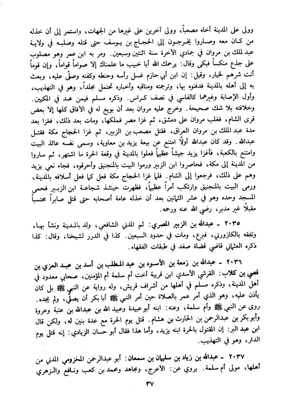 2035 - عبد الله بن الزبير المصري: ثم المدني الشافعي ولد بالمدينة ونشأ بها وتفقه بالكازورني فبرع ومات في حدود السبعين كذا في الدرر لشيخنا وقال: كذا ذكره العثماني قاضي قضاة صفد في طبقات الفقهاء.
