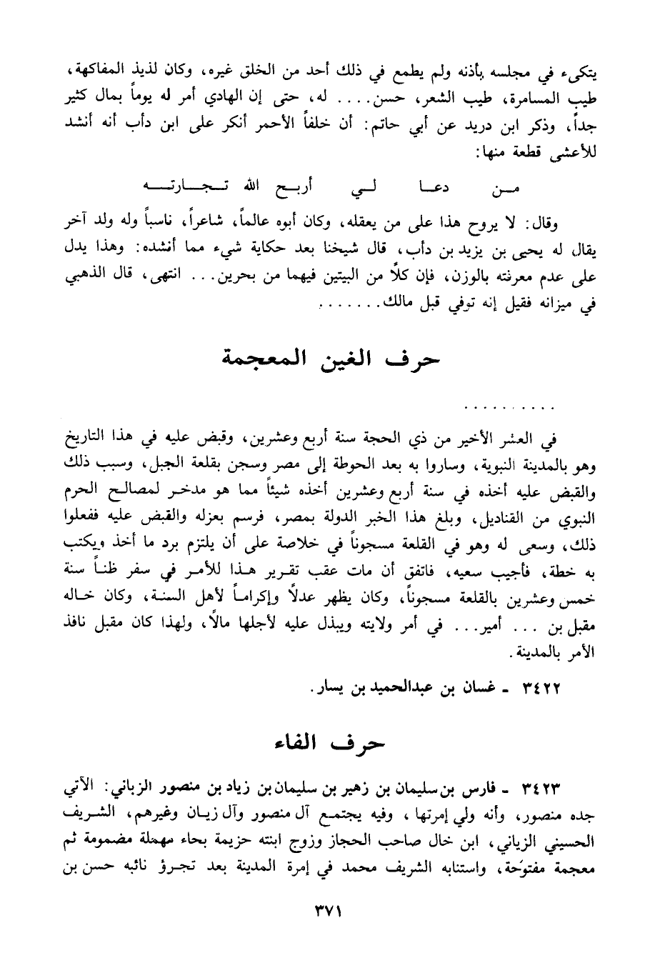 3423 - فارس بن سليمان بن زهير بن سليمان بن زياد بن منصور الزباني: الآتي جده منصور وأنه ولي إمرتها وفيه يجتمع آل منصور وآل زيان وغيرهم الشريف الحسيني الزياني ابن خال صاحب الحجاز وزوج ابنته حزيمة بحاء مهملة مضمومة ثم معجمة مفتوحة واستنابه الشريف محمد في إمرة المدينة بعد تجرؤ نائبه حسن بن