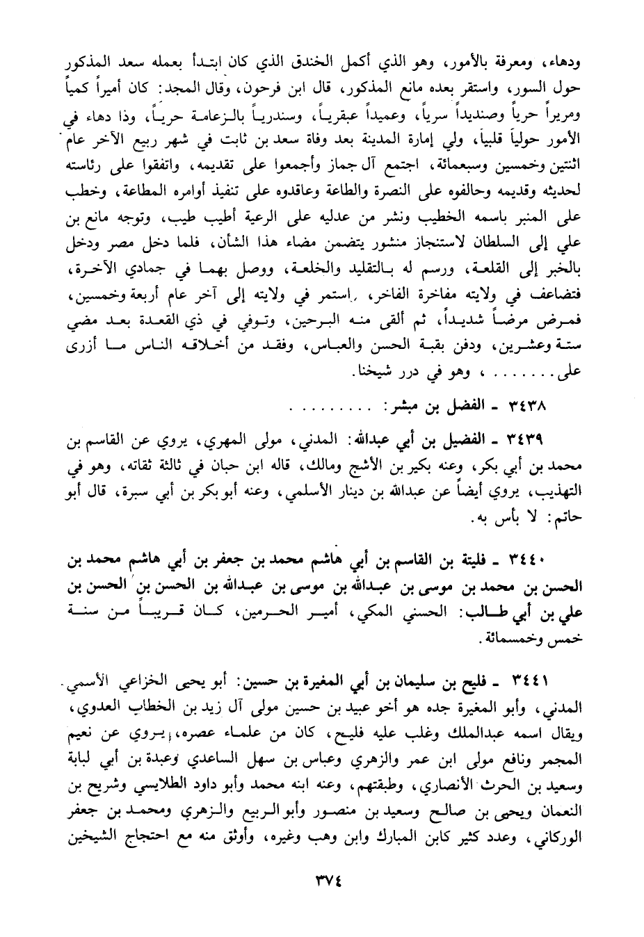 3440 - فليتة بن القاسم بن أبي هاشم محمد بن جعفر بن أبي هاشم محمد بن الحسن بن محمد بن موسى بن عبد الله بن موسى بن عبد الله بن الحسن بن الحسن بن علي بن أبي طالب: الحسني المكي أمير الحرمين كان قريبا من سنة خمس وخمسمائة.