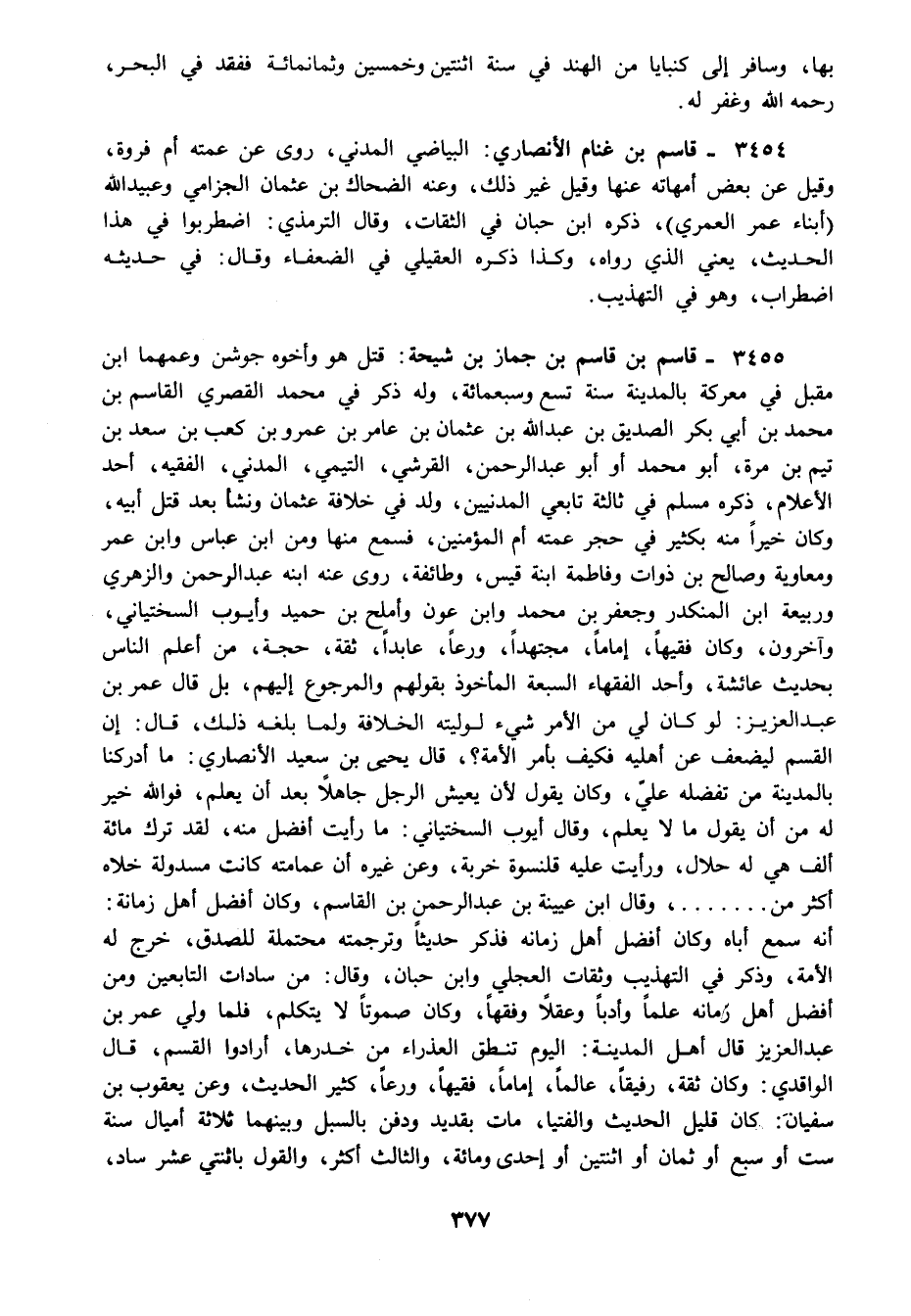 3455 - قاسم بن قاسم بن جماز بن شيحة: قتل هو وأخوه جوشن وعمهما ابن مقبل في معركة بالمدينة سنة تسع وسبعمائة وله ذكر في محمد القصري القاسم بن محمد بن أبي بكر الصديق بن عبد الله بن عثمان بن عامر بن عمرو بن كعب بن سعد بن تيم بن مرة أبو محمد أو أبو عبد الرحمن القرشي التيمي المدني الفقيه أحد الأعلام ذكره مسلم في ثالثة تابعي المدنيين ولد في خلافة عثمان ونشأ بعد قتل أبيه وكان خيرا منه بكثير في حجر عمته أم المؤمنين فسمع منها ومن ابن عباس وابن عمر ومعاوية وصالح بن ذوات وفاطمة ابنة قيس وطائفة روى عنه ابنه عبد الرحمن والزهري وربيعة ابن المنكدر وجعفر بن محمد وابن عون وأملح بن حميد وأيوب السختياني وآخرون وكان فقيها إماما مجتهدا ورعا عابدا ثقة حجة من أعلم الناس بحديث عائشة وأحد الفقهاء السبعة المأخوذ بقولهم والمرجوع إليهم بل قال عمر بن عبد العزيز: لو كان لي من الأمر شيء لوليته الخلافة ولما بلغه ذلك قال: إن القسم ليضعف عن أهليه فكيف بأمر الأمة؟ قال يحيى بن سعيد الأنصاري: ما أدركنا بالمدينة من تفضله علي وكان يقول لأن يعيش الرجل جاهلا بعد أن يعلم فوالله خير له من أن يقول ما لا يعلم وقال أيوب السختياني: ما رأيت أفضل منه لقد ترك مائة ألف هي له حلال ورأيت عليه قلنسوة خربة وعن غيره أن عمامته كانت مسدولة خلاه أكثر من وقال ابن عيينة بن عبد الرحمن بن القاسم وكان أفضل أهل زمانة: أنه سمع أباه وكان أفضل أهل زمانه فذكر حديثا وترجمته محتملة للصدق خرج له الأمة وذكر في التهذيب وثقات العجلي وابن حبان وقال: من سادات التابعين ومن أفضل أهل زمانه علما وأدبا وعقلا وفقها وكان صموتا لا يتكلم فلما ولي عمر بن عبد العزيز قال أهل المدينة: اليوم تنطق العذراء من خدرها ارادوا القسم قال الواقدي: وكان ثقة رفيقا عالما إماما فقيها ورعا كثير الحديث وعن يعقوب بن سفيان كان قليل الحديث والفتيا مات بقديد ودفن بالسبل وبينهما ثلاثة أميال سنة ست أو سبع أو ثمان أو اثنتين أو إحدى ومائة والثالث أكثر والقول باثنتي عشر ساد