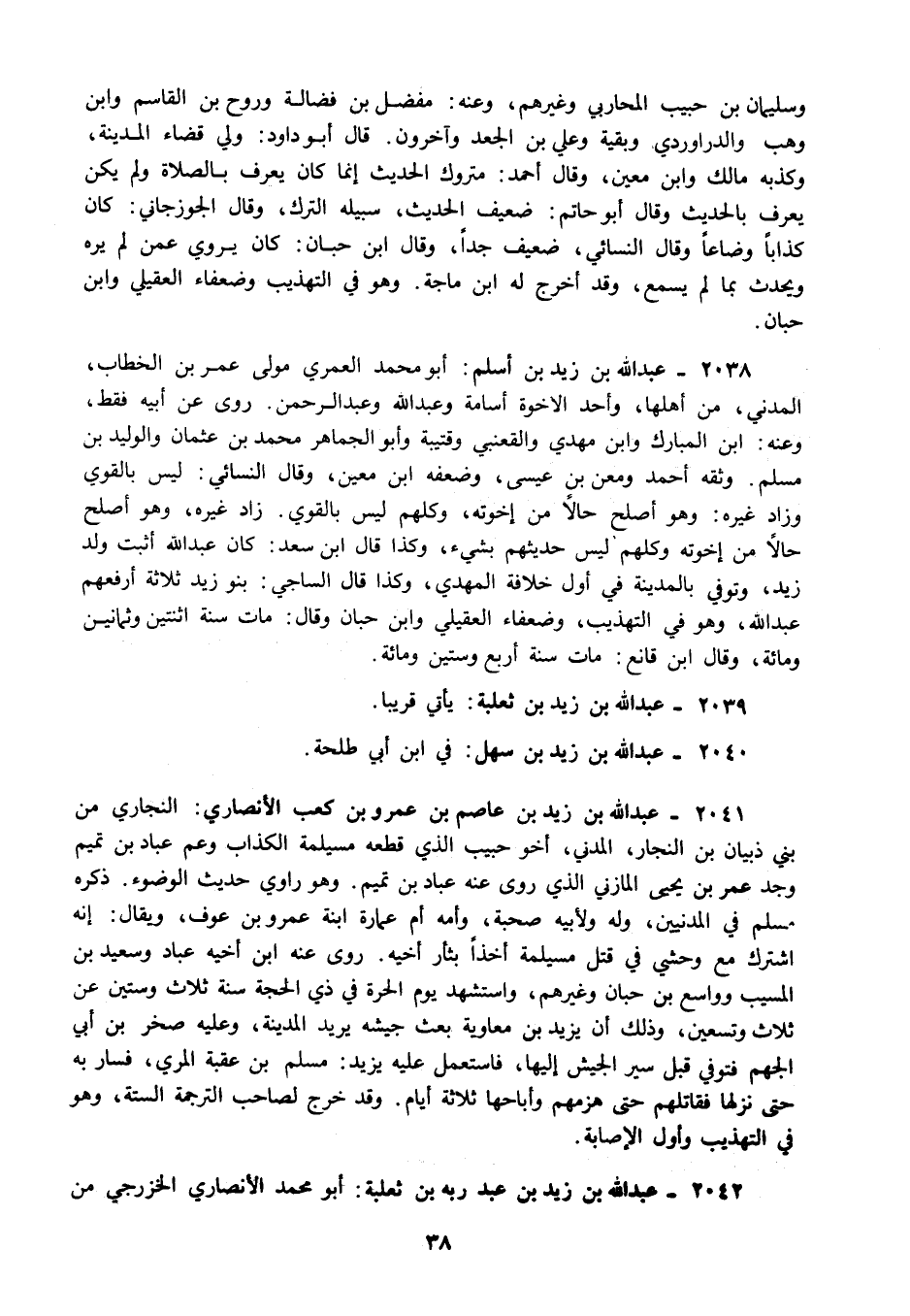 2038 - عبد الله بن زيد بن أسلم: أبو محمد العمري مولى عمر بن الخطاب المدني من أهلها وأحد الأخوة أسامة وعبد الله وعبد الرحمن روى عن أبيه فقط وعنه: ابن المبارك وابن مهدي والقعنبي وقتيبة وأبو الجماهر محمد بن عثمان والوليد بن مسلم وثقه أحمد ومعن بن عيسى وضعفه ابن معين وقال النسائي: ليس بالقوي وزاد غيره وهو أصلح حالا من إخوته وكلهم ليس بالقوي زاد غيره وهو أصلح حالا من إخوته وكلهم ليس حديثهم بشيء وكذا قال ابن سعد: كان عبد الله أثبت ولد زيد وتوفي بالمدينة في أول خلافة المهدي وكذا قال الساجي: بنو زيد ثلاثة أرفعهم عبد الله وهو في التهذيب وضعفاء العقيلي وابن حبان وقال: مات سنة اثنتين وثمانين ومائة وقال ابن قانع: مات سنة أربع وستين ومائة.