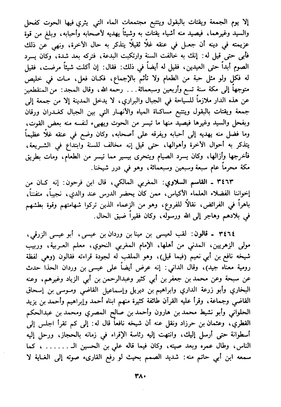 3463 - القاسم السلاوي: المغربي المالكي قال ابن فرحون: إنه كان من إخواننا الفضلاء العلماء الأكياس ممن كان يحضر الدرس عند والدي نجيبا متفننا باهرا في الفرائض نقالا للفروع وهو من الزعماء الذين تركوا شهامتهم وقوة بطشهم في بلادهم وهاجر إلى الله ورسوله وكان فقيرا ضيق الحال.