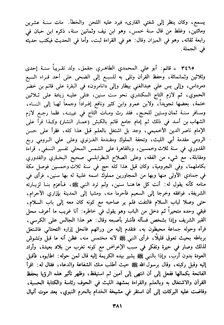 3465 – قاتم: أبو علي المحمدي الطاهري جقمق ولد تقريبا سنة إحدى وثلاثين وثمانمائة وحفظ القرآن وتلى به للسبع إلى الضحى على أحد قراء السبع دمرداس وإلى يس علي عبد الغني بيطار وإلى "أنامرون" في البقرة على قاتم بن خضر الحموي ثم لازم التاج السكندري نحو ست سنين فتلى عليه زيادة على ثلاثين ختمة بعضها تجويدا ولابن عمرو وابن كثير ونافع إفرادا وجمعا لها إلى النساء وسافر سنة ثمان وستين للحج فقد رث ومات التاج في غيبته فلما رجع لازم الشهاب بن أسد في ذلك ثم إمام جامع قاتم بالكبش "عمار النشار" وكذا قرأ على الإمام ناصر الدين الأخميمي وجد بل اشتغل بالعلم قبل هذا كله فقرأ علىحسن الرومي مقدمة أبي الليث وتحفة الملوك ومقدمة الغزنوي وعلى علي الرومي ربع القدوري في سنة ثلاث وخمسين وبالقاهرة على الشمس المحلي تفسير النسفي قراءة ومقابلة مع شيء من الفقه وعلى الصلاح الطرابلسي صحيح البخاري والقدوري بكاملهما وفي الجرومية وكان قبل هذا كله حج في سنة ثلاث وخمسين فوصل مكة في جمادي الأولى منها وبها من المجاورين مملوك اسمه غلبية له بها سنين فرأى في منامه كأنه يقول له: أنت كل ها هنا سنين ولم ترد النبي صلى الله عليه وسلم فأعزم بنا لزيارته الشريفة فوافقه وخرجا إلى السعيم فأحرما منه ومشيا إلى المدينة بإزاري الأحرام حتى وصلا لباب السلام فالتفت فلم ير صاحبه مع كونه كان معه إلى باب السلام فبقي وحده متحيرا ثم دخل من الباب وهو يقول في خاطره: أنا غريب ما أعرف محل القبر الشريف وإذا بشخص فسأله فأشار باصبعه وقال: هو هذا الجالس على الكرسي فرآه وحوله جماعة محيطون به فتقدم إليه من ورائهم فانحل إزاره التحتاني فاشتغل برباطه بحيث تعوق قليلا فرأى النبي صلى الله عليه وسلم لأنه مختمس منه فظن أنه ما قبل وتشوش لذلك وصار في حيرة وتفكر في سبب الإعراض مع كونه تغرب من بلاد بعيدة وأراد العودة بدون أرب وإذا بالنبي صلى الله عليه وسلم يشير بيده الكريمة إليه قال لمن حوله: اطلبوه فأقبل إليه وقبل ركبته وقال برسول الله صلى الله عليه وسلم حيث اطلب منك الشفاعة والدعاء فقال له: أقرأ الفاتحة بكمالها ففعل إلى أن انتهى إلى آمين ثم استيقظ وظهر تأثير هذه الرؤيا بحفظ القرآن والاشتغال به وبالعلم والقراءة بمشهد الليث في الحوف رئاسة والكتابة الحسبة وفاضت عليه البركات إلى أن استقر في مشيخة الخدام بالحرم النبوي بعد موت أنيال