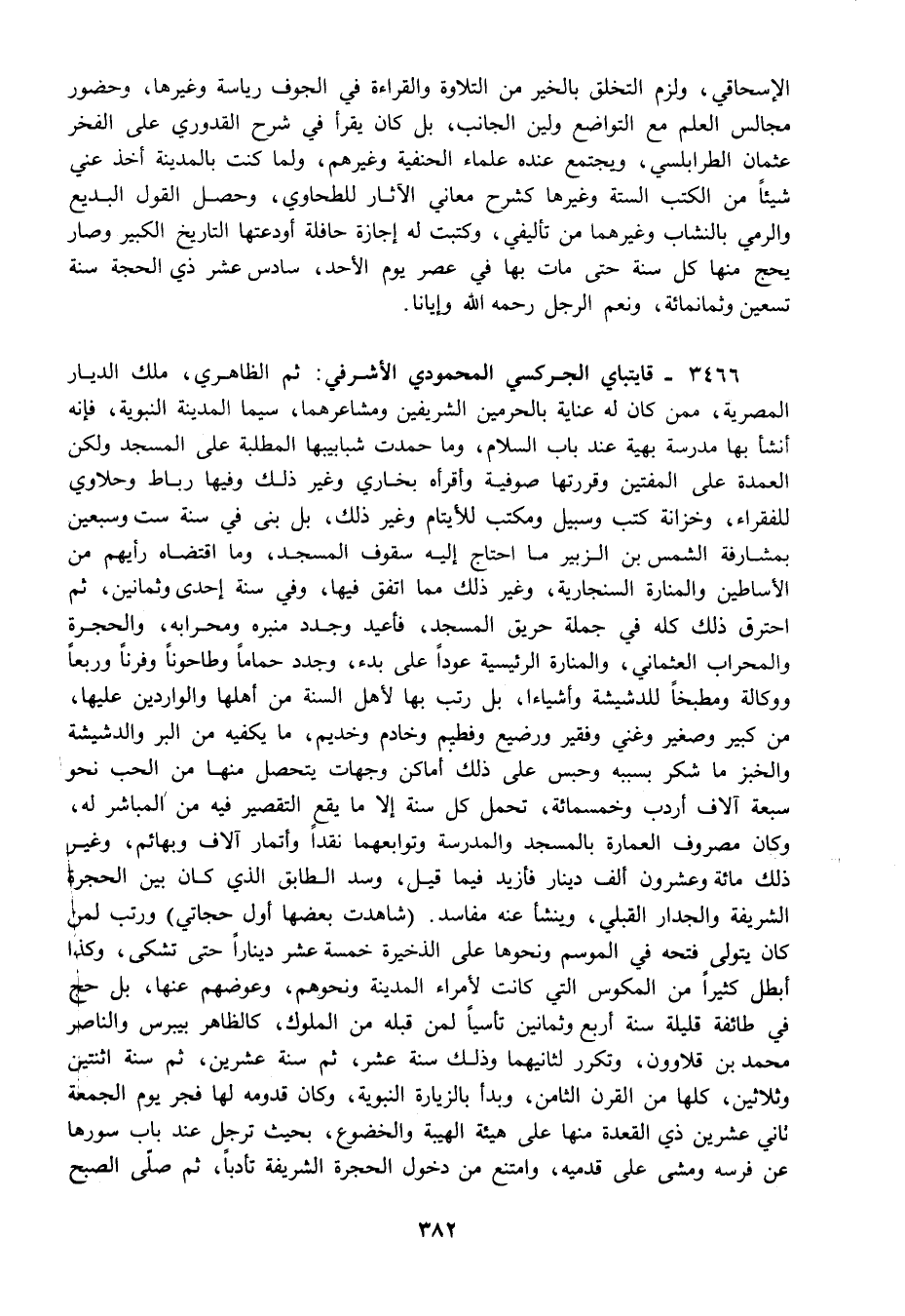 3466 - قايتباي الجركسي المحمودي الأشرفي: ثم الظاهري ملك الديار المصرية ممن كان له عناية بالحرمين الشريفين ومشاعرهما سيما المدينة النبوية فإنه أنشأ بها مدرسة بهية عند باب السلام وما حمدت شبابيبها المطلبة على المسجد ولكن العمدة علىالمفتين وقررتها صوفية وأقرأه بخاري وغير ذلك وفيها رباط وحلاوي للفقراء وخزانة كتب وسبيل ومكتب للأيتام وغير ذلك بل بنى في سنة ست وسبعين بمشارفة الشمس بن الزبير ما احتاج إليه سقوف المسجد وما اقتضاه رأيهم من الأساطين والمنارة السنجارية وغير ذلك مما اتفق فيها وفي سنة إحدى وثمانين ثم احترق ذلك كله في جملةحريق المسجد فأعيد وجدد منبره ومحرابه والحجرة والمحراب العثماني والمنارة الرئيسية عودا على بدء وجدد حماما وطاحونا وفرنا وربعا ووكالة ومطبخا للدشيشة وأشياءا بل رتب بها لأهل السنة من أهلها والواردين عليها من كبير وصغير وغني وفقير ورضيع وفطيم وخادم وخديم ما يكفيه من البر والدشيشة والخبر ما شكر بسببه وحبس على ذلك أماكن وجهات يتحصل منها من الحب نحو سبعة آلاف أردب وخمسمائة تحمل كل سنة إلا ما يقع التقصير فيه من المباشر له وكان مصروف العمارة بالمسجد والمدرسة وتوابعهما نقدا وأتمار آلاف وبهائم وغير ذلك مائة وعشرون ألف دينار فأزيد فيما قيل وسد الطابق الذي كان بين الحجرة الشريفة والجدار القبلي وينشأ عنه مفاسد "شاهدت بعضها أول حجاتي" ورتب لمن كان يتولى فتحه في الموسم ونحوها على الذخيرة خمسة عشر دينارا حتى تشكى وكذا أبطل كثيرا من المكوس التي كانت لأمراء المدينة ونحوهم وعوضهم عنها بل حج في طائفة قليلة سنة اربع وثمانين تأسيا لمن قبله من الملوك كالظاهر بيبرس والناصر محمد بن قلاوون وتكرر لثانيهما وذلك سنة عشر ثم سنة عشرين ثم سنة اثنتين وثلاثين كلها من القرن الثامن وبدأ بالزيارة النبوية وكان قدومه لها فجر يوم الجمعة ثاني عشرين ذي القعدة منها على هيئة الهيبة والخضوع بحيث ترجل عند باب سورها عن فرسه ومشى على قدميه وامتنع من دخول الحجرة الشريفة تأدبا ثم صلى الصبح