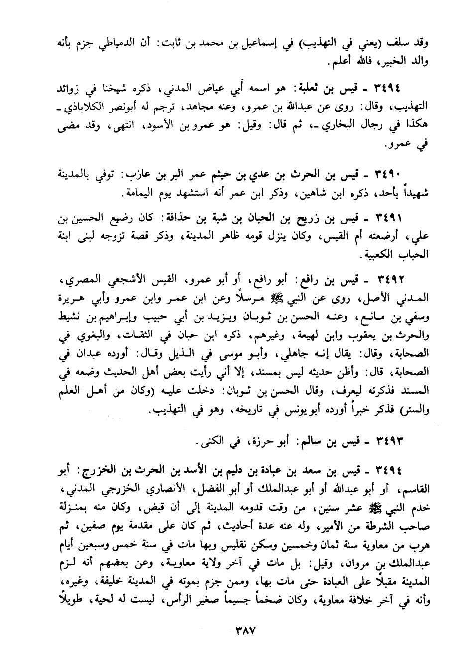 3494 - قيس بن ثعلبة: هو اسمه أبي عياض المدني ذكره شيخنا في زوائد التهذيب وقال: روى عن عبد الله بن عمرو وعنه مجاهد ترجم له أبو نصر الكلاباذي - هكذا في رجال البخاري - ثم قال: وقيل: هو عمرو بن الأسود انتهى وقد مضى في عمرو.