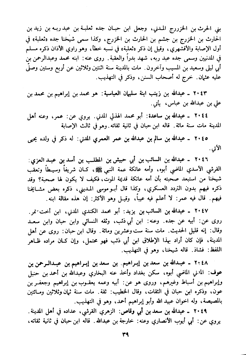 2048 - عبد الله بن سعد بن إبراهيم بن سعد بن إبراهيم بن عبد الرحمن بن عوف: المدني الماضي أبوه سكن بغداد وأخذ عنه البخاري وعبد الله بن أحمد بن حنبل وإبراهيم بن أسباط وغيرهم وروى هو عن: أبيه وعمه يعقوب بن إبراهيم وجعفر بن عون وذكره ابن حبان في الثقات وقال الخطيب: ثقة مات سنة ثمان وثلاثين ومائتين بالمصيصة وله أخوان عبيد الله وأبو إبراهيم أحمد وهو في التهذيب.