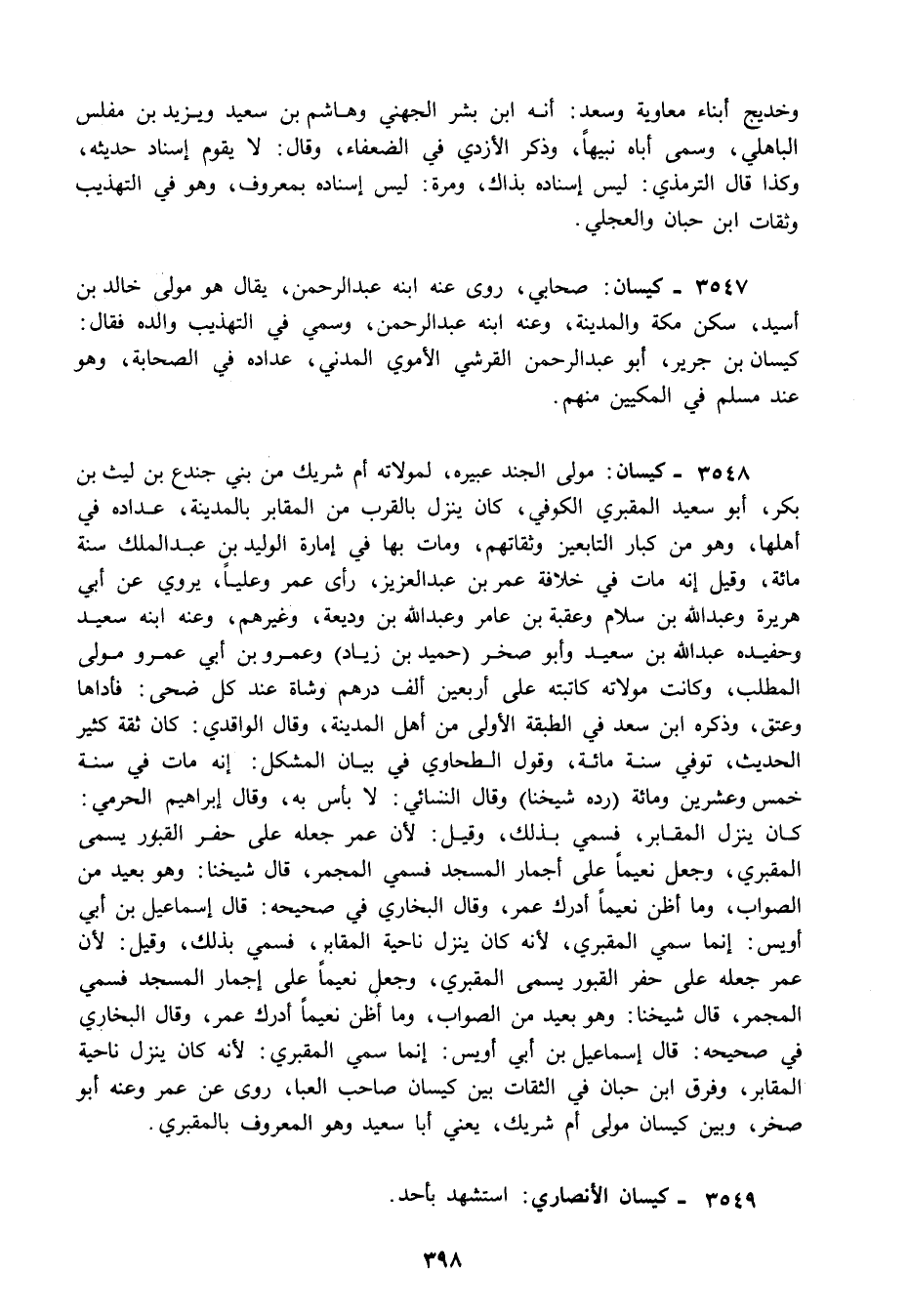 3547 – كيسان: صحابي روى عنه ابنه عبد الرحمن يقال هو مولى خالد بن أسيد سكن مكة والمدينة وعنه ابنه عبد الرحمن وسمي في التهذيب والده فقال: كيسان بن جرير أبو عبد الرحمن القرشي الأموي المدني عداده في الصحابة وهو عند مسلم في المكيين منهم.