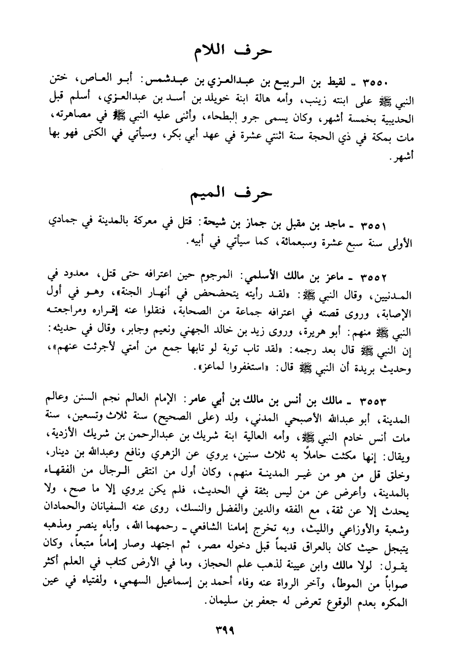 3552 - ماعز بن مالك الأسلمي: المرجوم حين اعترافه حتى قتل معدود في المدنيين وقال النبي صلى الله عليه وسلم: "لقد رأيته يتحضحض في أنهار الجنة" وهو في أول الإصابة وروى قصته في اعترافه جماعة من الصحابة فنقلوا عنه إقراره ومراجعته النبي صلى الله عليه وسلم منهم أبو هريرة وروى زيد بن خالد الجهني ونعيم وجابر وقال في حديثه إن النبي صلى الله عليه وسلم بعد رجمه: "لقد تاب توبة لو تابها جمع من أمتي لأ جرئت عنهم" وحديث بريدة أن النبي صلى الله عليه وسلم قال: "استغفروا لماعز"