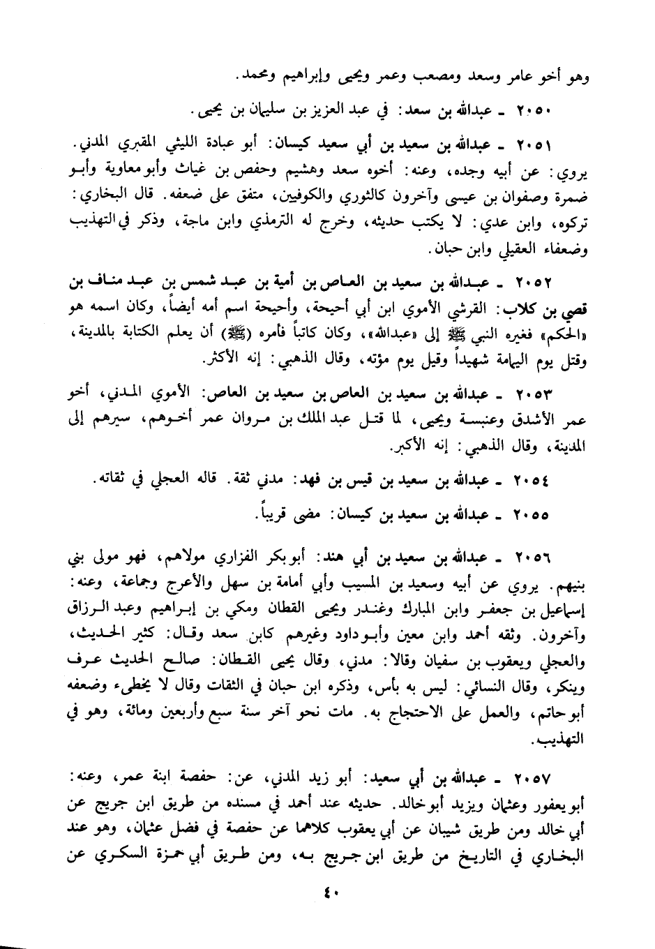 2053 - عبد الله بن سعيد بن العاص بن سعيد بن العاص: الأموي المدني أخو عمر الأشدق وعنبسة ويحيى لما قتل عبد الملك بن مروان عمر أخوهم سيرهم إلى المدينة وقال الذهبي إنه الأكبر.