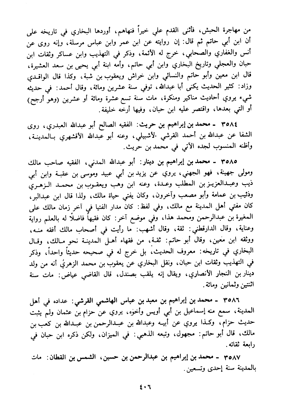 3586 - محمد بن إبراهيم بن معبد بن عباس الهاشمي القرشي: عداده في أهل المدينة سمع منه إسماعيل بن أبي أويس وأخوه يروي عن حزام بن عثمان ولم يثبت حديث حزام وكذا يروي عن أبيه وعبد الله بن عبد الرحمن بن عبد الله بن كعب بن مالك قال أبو حاتم: مجهول وتبعه الذهبي: في الميزان ولكن ذكره ابن حبان في رابعة ثقاته.