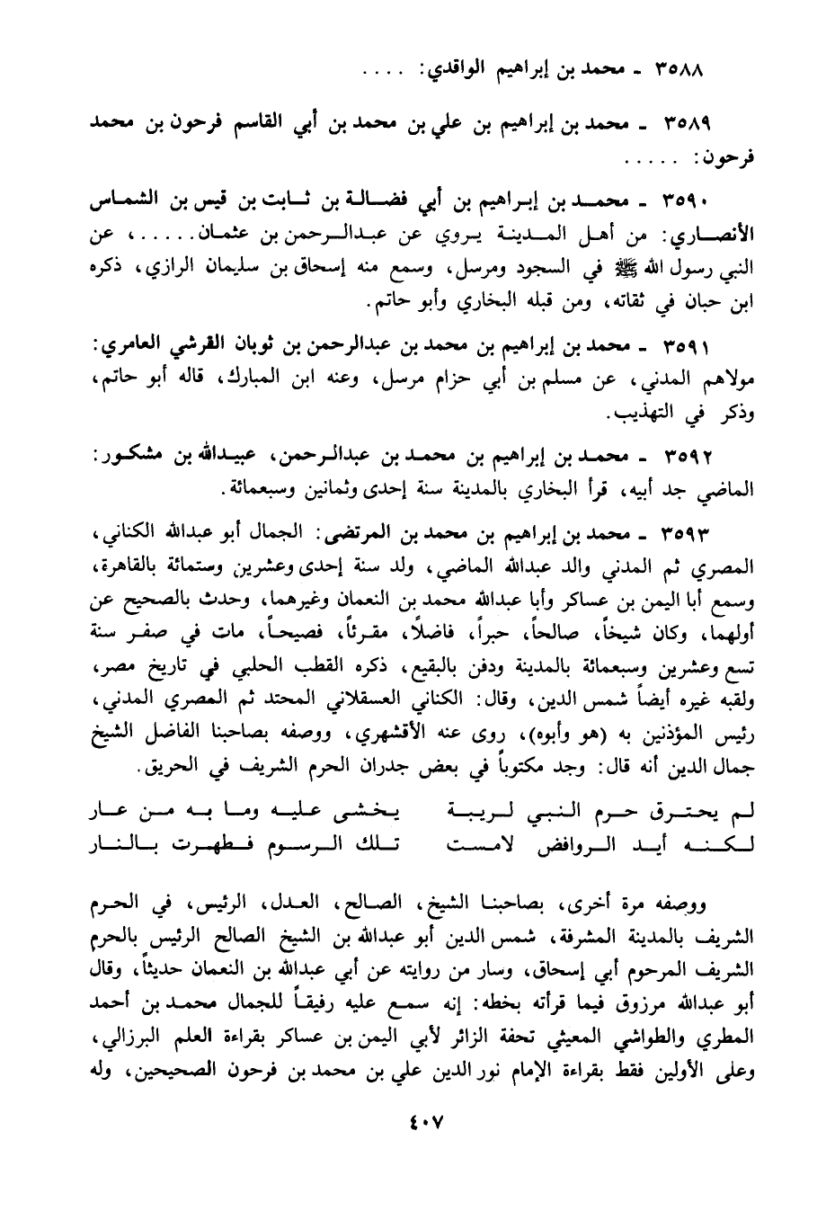 3593 - محمد بن إبراهيم بن محمد بن المرتضى: الجمال أبو عبد الله الكناني المصري ثم المدني والد عبد الله الماضي ولد سنة إحدى وعشرين وستمائة بالقاهرة وسمع أبا اليمن بن عساكر وأبا عبد الله محمد بن النعمان وغيرهما وحدث بالصحيح عن أولهما وكان شيخا صالحا حبرا فاضلا مقرئا فصيحا مات في صفر سنة تسع وعشرين وسبعمائة بالمدينة ودفن بالبقيع ذكره القطب الحلبي في تاريخ مصر ولقبه غيره ايضا شمس الدين وقال: الكناني العسقلاني المحتد ثم المصري المدني رئيس المؤذنين به "هو وأبوه" روى عنه الأقشهري ووصفه بصاحبنا الفاضل الشيخ جمال الدين أنه قال: وجد مكتوبا في بعض جدران الحرم الشريف في الحريق: