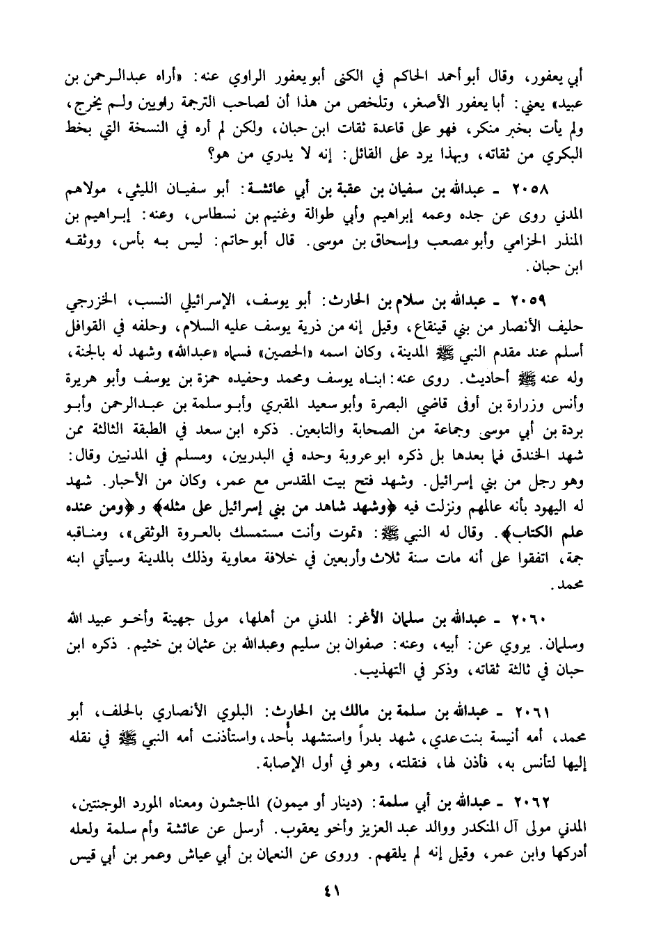 2059 - عبد الله بن سلام بن الحارث: أبو يوسف الإسرائيلي النسب الخزرجي حليف الأنصار من بني قينقاع وقيل إنه من ذرية يوسف عليه السلام وحلفه في القوافل أسلم عند مقدم النبي صلى الله عليه وسلم المدينة وكان اسمه "الحصين" فسماه "عبد الله" وشهد له بالجنة وله عنه صلى الله عليه وسلم أحاديث روى عنه: ابناه يوسف ومحمد وحفيده حمزة بن يوسف وأبو هريرة وأنس وزرارة بن أوفى قاضي البصرة وأبو سعيد المقبري وأبو سلمة بن عبد الرحمن وأبو بردة بن أبي موسى وجماعة من الصحابة والتابعين ذكره ابن سعد في الطبقة الثالثة ممن شهد الخندق فيما بعدها بل ذكره ابو عروبة وحده في البدريين ومسلم في المدنيين وقال: وهو رجل من بني إسرائيل وشهد فتح بيت المقدس مع عمر وكان من الأحبار شهد له اليهود بأنه عالمهم ونزلت فيه {وَشَهِدَ شَاهِدٌ مِنْ بَنِي إِسْرائيلَ عَلَى مِثْلِهِ} و {وَمَنْ عِنْدَهُ عِلْمُ الْكِتَابِ} وقال له النبي صلى الله عليه وسلم: "تموت وأنت مستمسك بالعروة الوثقى" ومناقبه جمة اتفقوا على أنه مات سنة ثلاث وأربعين في خلافة معاوية وذلك بالمدينة وسيأتي ابنه محمد.