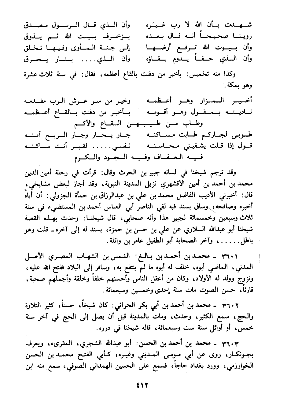 3602 - محمد بن أحمد بن أبي بكر الحراني: كان شيخا حسنا كثير التلاوة والحج سمع الكثير وحدث ومات بالمدينة قبل أن يصل إلى الحج في آخر سنة خمس أو أوائل سنة ست وسبعمائة قاله شيخنا في درره.