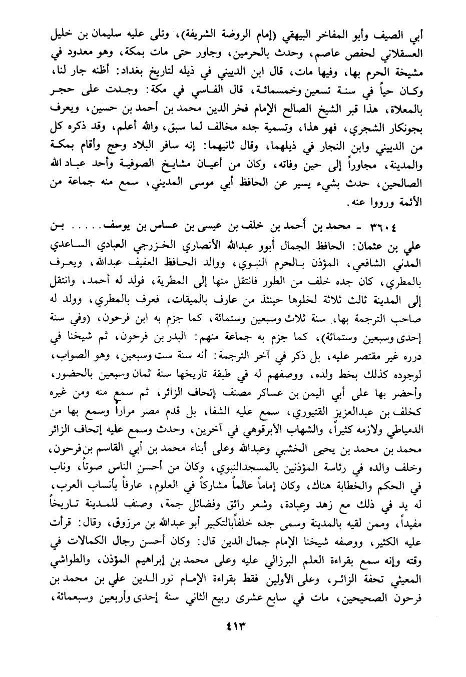 3604 - محمد بن أحمد بن خلف بن عيسى بن عساس بن يوسف بن علي بن عثمان: الحافظ الجمال أبوو عبد الله الأنصاري الخزرجي العبادي الساعدي المدني الشافعي المؤذن بالحرم النبوي ووالد الحافظ العفيف عبد الله ويعرف بالمطري كان جده خلف من الطور فانتقل منها إلى المطرية فولد له أحمد وانتقل إلى المدينة ثالث ثلاثة لخلوها حينئذ من عارف بالميقات فعرف بالمطري وولد له صاحب الترجمة بها سنة ثلاث وسبعين وستمائة كما جزم به ابن فرحون "وفي سنة إحدى وسبعين وستمائة" كما جزم به جماعة منهم: البدر بن فرحون ثم شيخنا في درره غير مقتصر عليه بل ذكر في آخر الترجمة: أنه سنة ست وسبعين وهو الصواب لوجوده كذلك بخط ولده ووصفهم له في طبقة تاريخها سنة ثمان وسبعين بالحضور وأحضر بها على أبي اليمن بن عساكر مصنف إتحاف الزائر ثم سمع منه ومن غيره كخلف بن عبد العزيز القتيوري سمع عليه الشفا بل قدم مصر مرارا وسمع بها من الدمياطي ولازمه كثيرا والشهاب الأبرقوهي في آخرين وحدث وسمع عليه إتحاف الزائر محمد بن محمد بن يحيى الخشبي وعبد الله وعلى أبناء محمد بن أبي القاسم بن فرحون وخلف والده في رئاسة المؤذنين بالمسجد النبوي وكان من أحسن الناس صوتا وناب في الحكم والخطابة هناك وكان إماما عالما مشاركا في العلوم عارفا بأنساب العرب له يد في ذلك مع زهد وعبادبة وشعر رائق وفضائل جمة وصنف للمدينة تاريخا مفيدا وممن لقيه بالمدينة وسمى جده خلفا بالتكبير أبو عبد الله بن مرزوق وقال: قرأت عليه الكثير ووصفه شيخنا الإمام جمال الدين قال: وكان أحسن رجال الكمالات في وقته وإنه سمع بقراءة العلم البرزالي عليه وعلى محمد بن إبراهيم المؤذن والطواشي المعيثي تحفة الزائر وعلى الأولين فقط بقراءة الإمام نور الدين علي بن محمد بن فرحون الصحيحين مات في سابع عشري ربيع الثاني سنة إحدى وأربعين وسبعمائة