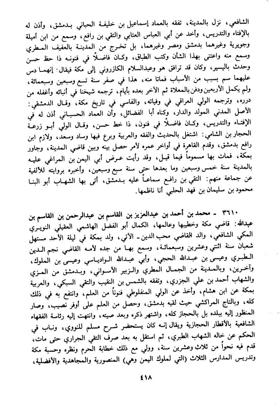 3610 - محمد بن أحمد بن عبد العزيز بن القاسم بن عبد الرحمن بن القاسم بن عبد الله: قاضي مكة وخطيبها وعالمها الكمال أبو الفضل الهاشمي العقيلي النويري المكي الشافعي والد القاضي محب الدين - الآتي - ولد بمكة في ليلة الأحد مستهل شعبان سنة اثنتي وعشرين وسبعمائة وسمع بها من جده لأمه القاضي نجم الدين الطبري وعيسى بن عبد الله الحجي وأبي عبد الله الوادياسي وعيسى بن الملوك وآخرين وبالمدينة من الجمال المطري والزبير الأسواني بدمشق من المزي والشهاب أحمد بن علي الجزري وتفقه بالشمس بن النقيب والتقي السبكي والعربية بمكة عن ابن هشام وأخذ عن الولي المنفلوطي فنونا من العلم وانتفع به في ذلك كله وبالتاج المراكشي حيث لقيه بدمشق وحصل من العلم على أوفر نصيب وصار المنظور إليه ببلده بل بالحجاز كله واشتهر ذكره وبعد صيته وانتهت إليه رئاسة الفقهاء الشافعية بالأقطار الحجازية ويقال إنه كان يستحضر شرح مسلم للنووي وناب في الحكم عن خاله الشهاب الطبري ثم استقل به بعد صرف التقي الجراري حتى مات قدم نحوا من ثلاث وعشرين سنة وولي مع ذلك خطابة الحرم ونظره وحسبة مكة وتدريس المدارس الثلاث التي لملوك اليمن وهي المنصورية والمجاهدية والأفضلية