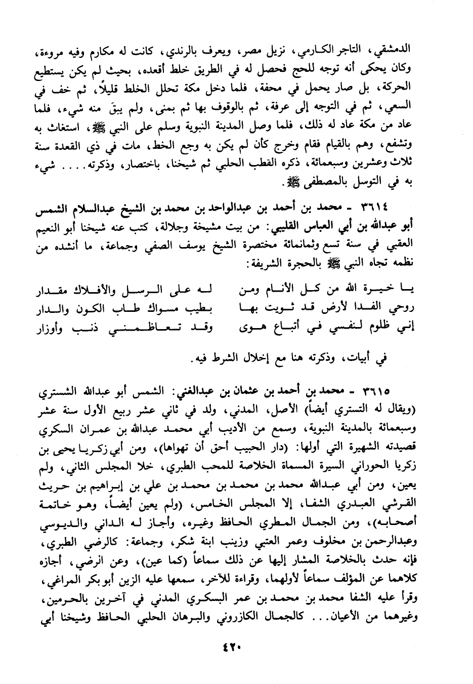 3614 - محمد بن أحمد بن عبد الواحد بن محمد بن الشيخ عبد السلام الشمس أبو عبد الله بن أبي العباس القليبيى: من بيت مشيخة وجلالة كتب عنه شيخنا أبو النعيم العقبي في سنة تسع وثمانمائة مختصرة الشيخ يوسف الصفي وجماعة ما أنشده من نظمه تجاه النبي صلى الله عليه وسلم بالحجرة الشريفة: