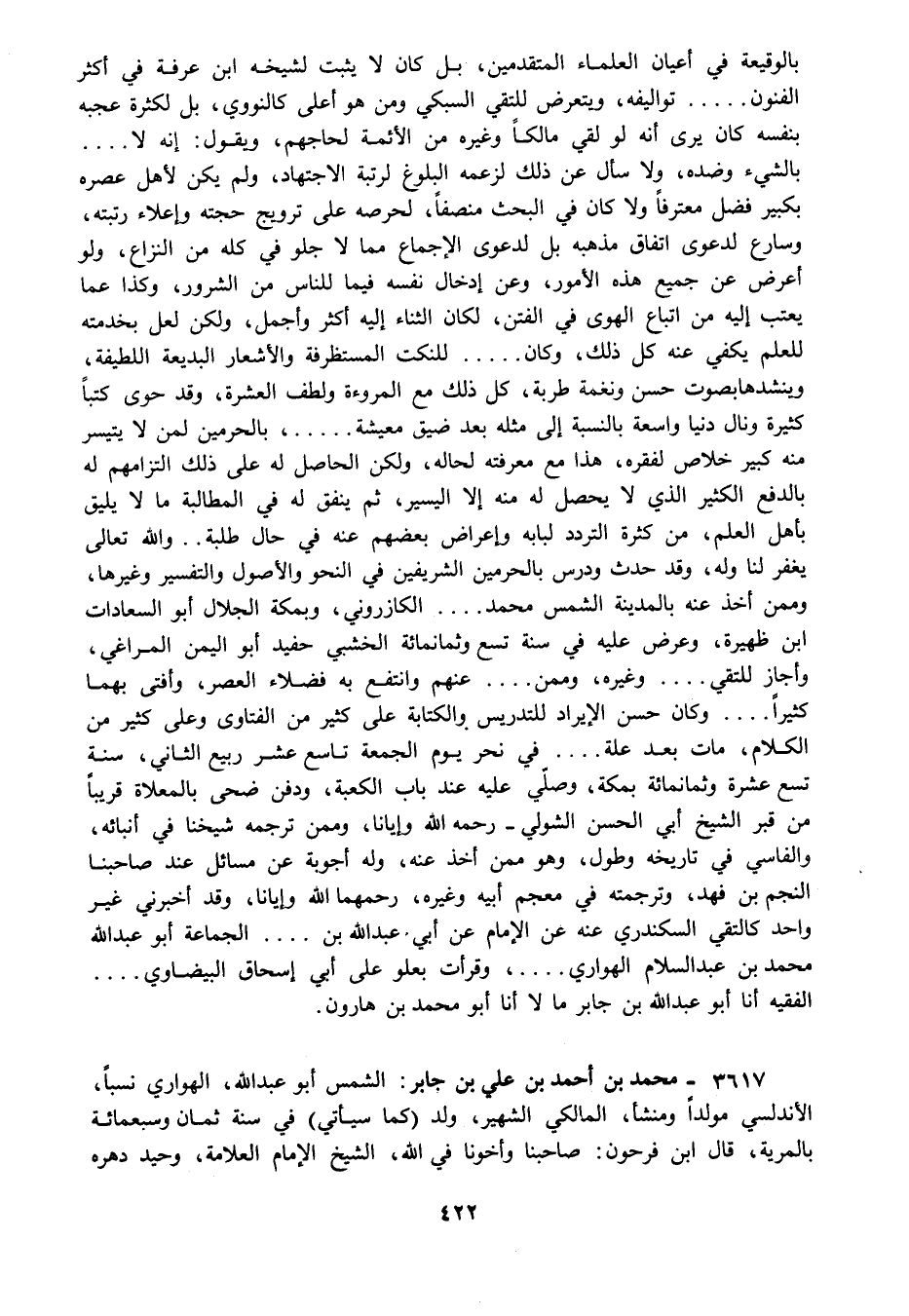 3617 - محمد بن أحمد بن علي بن جابر: الشمس أبو عبد الله الهواري نسبا الأندلسي مولدا ومنشأ المالكي الشهير ولد "كما سيأتي" في سنة ثمان وسبعمائة بالمرية قال ابن فرحون: صاحبنا وأخونا في الله الشيخ الإمام العلامة وحيد دهره