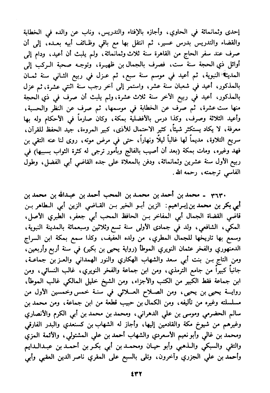 3630 - محمد بن أحمد بن محمد بن المحب أحمد بن عبد الله بن محمد بن أبي بكر بن محمد بن إبراهيم: الزين أبو الخير بن القاضي الزين أبي الطاهر بن قاضي القضاة الجمال أبي المفاخر بن الحافظ المحب أبي جعفر الطبري الأصل المكي الشافعي ولد في جمادى الأولى سنة تسع وثلاثين وسبعمائة بالمدينة النبوية وسمع بها تاريخها للجمال المطري من ولده العفيف وكذا سمع بمكة ابن السراج الدمنهوري والفخر عثمان النويري الموطأ "رواية يحيى بن بكير" في سنة أربع وأربعين ومن التاج بن بنت أبي سعد والشهاب الهكاري والنور الهمداني والعز بن جماعة جانبا كبيرا من جامع الترمذي ومن ابن جماعة والفخر النويري غالب النسائي ومن ابن جماعة فقط الكبير من الكتب والأجزاء ومن الشيخ خليل المالكي غالب الموطأ رواية يحيى بن يحيى ومن الصلاح العلائي في سنة خمس وخمسين الأول من مسلسلته وغيره من تأليفه ومن الكمال بن حبيب قطعة من ابن جماعة ومن محمد بن سالم الحضرمي وموسى بن علي الدهراني ومحمد بن محمد بن أبي الكرم والأنصاري وغيرهم من شيوخ مكة والقادمين إليها وأجاز له الشهاب بن كسنعدي والبدر الفارقي ومحمد بن غالي وأبو نعيم الأسعردي والشهاب أحمد بن علي المشتولي والأئمة المزي والتقي والسبكي والذهبي وأبو حيان ومحمد بن أبي بكر بن أحمد بن عبد الدايم وأحمد بن علي الجزري وآخرون وتلى بالسبع على المقري ناصر الدين العقبي وأبي