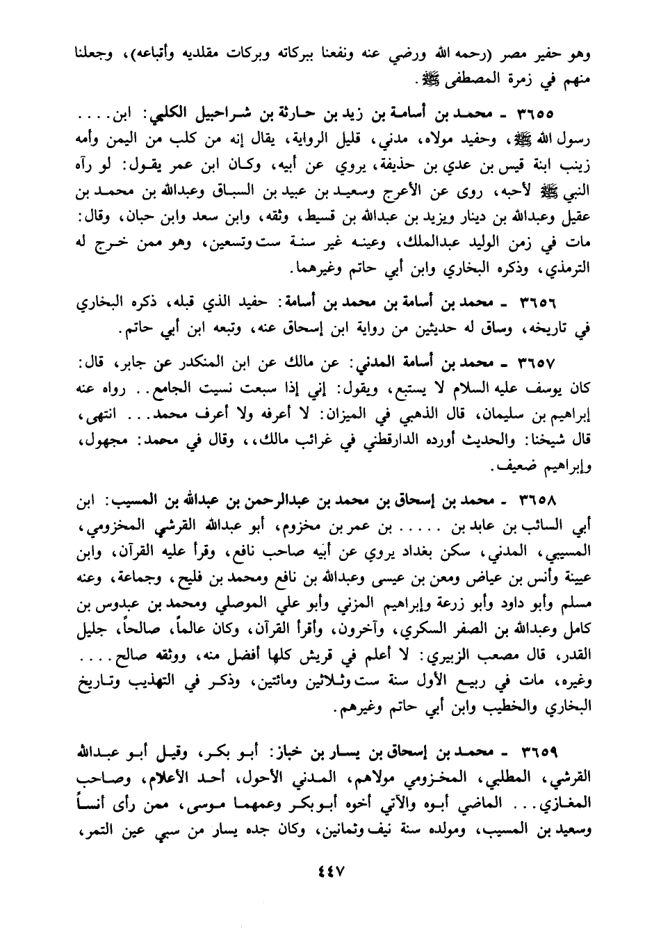 3656 - محمد بن أسامة بن محمد بن أسامة: حفيد الذي قبله ذكره البخاري في تاريخه وساق له حديثين من رواية ابن إسحاق عنه وتبعه ابن أبي حاتم.