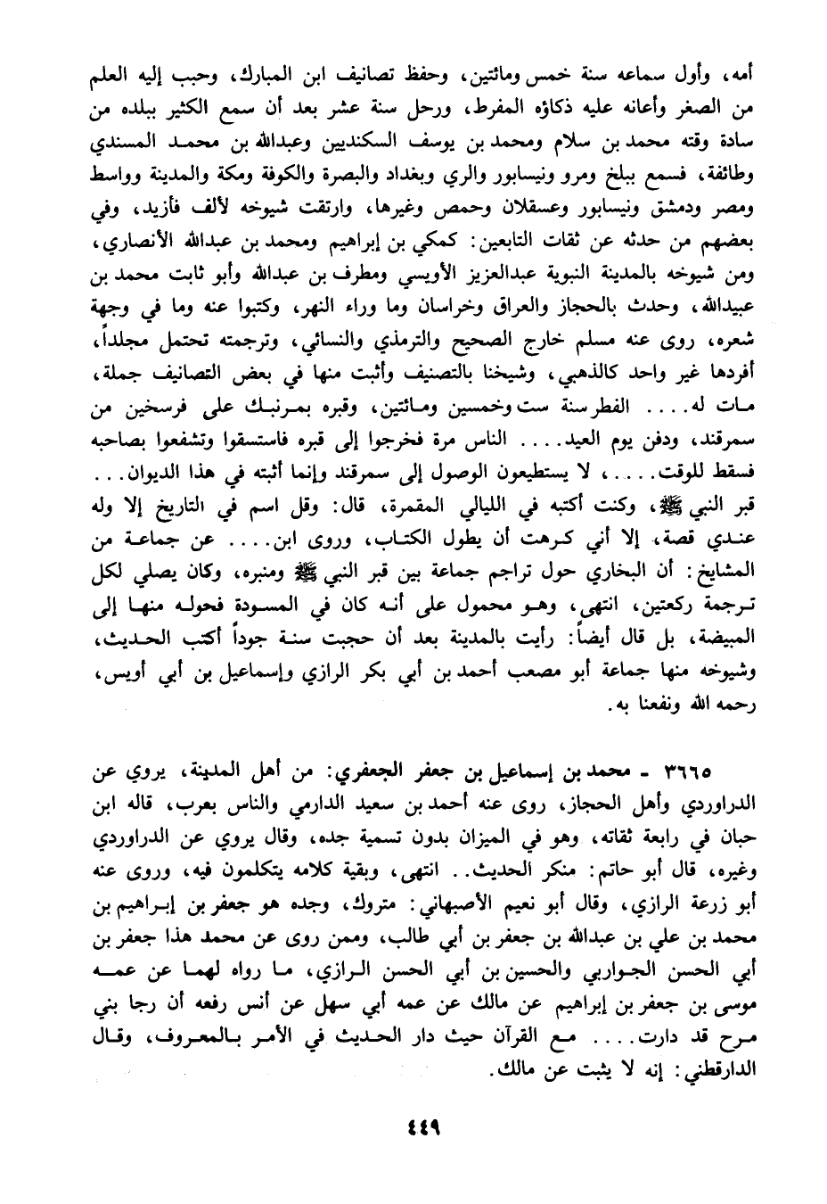 3665 - محمد بن إسماعيل بن جعفر الجعفري: من أهل المدينة يروي عن الدراوردي وأهل الحجاز روى عنه أحمد بن سعيد الدارمي والناس بعرب قاله ابن حبان في رابعة ثقاته وهو في الميزان بدون تسمية جده وقال يروي عن الدراوردي وغيره قال أبو حاتم: منكر الحديث انتهى وبقية كلامه يتكلمون فيه وروى عنه أبو زرعة الرازي وقال أبو نعيم الأصبهاني: متروك وجده هو جعفر بن إبراهيم بن محمد بن علي بن عبد الله بن جعفر بن أبي طالب وممن روى عن محمد هذا جعفر بن أبي الحسن الجواربي والحسين بن أبي الحسن الرازي ما رواه لهما عن عمه موسى بن جعفر بن إبراهيم عن مالك عن عمه أبي سهل عن أنس رفعه أن رجا بني مرح قد دارت مع القرآن حيث دار الحديث في الأمر بالمعروف وقال الدارقطني: إنه لا يثبت عن مالك.