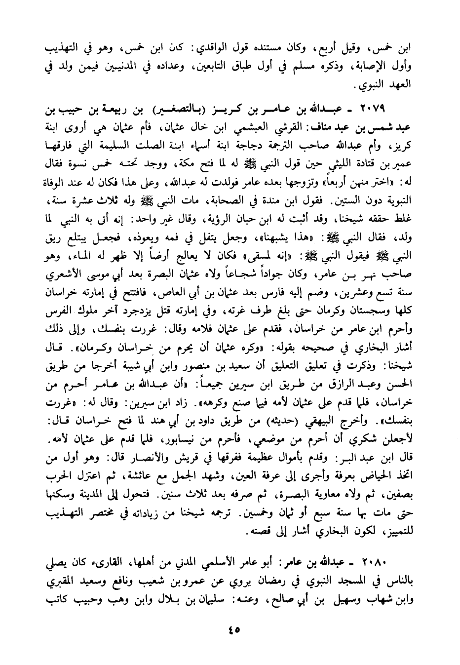 2079 - عبد الله بن عامر بن كريز بالتصغير بن ربيعة بن حبيب بن عبد شمس بن عبد مناف: القرشي العبشمي ابن خال عثمان فأم عثمان هي أروى ابنة كريز وأم عبد الله صاحب الترجمة دجاجة ابنة أسماء ابنة الصلت السلمية التي فارقها عمير بن قتادة الليثي حين قول النبي صلى الله عليه وسلم له لما فتح مكة ووجد تحته خمس نسوة فقال له: "اختر منهن أربعا" وتزوجها بعده عامر فولدت له عبد الله وعلى هذا فكان له عند الوفاة النبوية دون الستين فقول ابن مندة في الصحابة مات النبي صلى الله عليه وسلم وله ثلاث عشرة سنة غلط حققه شيخنا وقد أثبت له ابن حبان الرؤية وقال غير واحد: إنه أتى به النبي صلى الله عليه وسلم لما ولد فقال النبي صلى الله عليه وسلم: "هذا يشبهنا" وجعل يتفل في فمه ويعوذه فجعل يبتلع ريق النبي صلى الله عليه وسلم فيقول النبي صلى الله عليه وسلم: "إنه لمسقى" فكان لا يعالج أرضا إلا ظهر له الماء وهو صاحب نهر بن عامر وكان جوادا شجاعا ولاه عثمان البصرة بعد أبي موسى الأشعري سنة تسع وعشرين وضم إليه فارس بعد عثمان بن أبي العاص فافتتح في إمارته خراسان كلها وسجستان وكرمان حتى بلغ طرف غرته وفي إمارته قتل يزدجرد آخر ملوك الفرس وأحرم ابن عامر من خراسان فقدم على عثمان فلامه وقال: غررت بنفسك وإلى ذلك أشار البخاري في صحيحه بقوله: "وكره عثمان أن يحرم من خراسان وكرمان" قال شيخنا: وذكرت في تعليق التعليق أن سعيد بن منصور وابن أبي شيبة أخرجا من طريق الحسن وعبد الرازق من طريق ابن سيرين جميعا: "أن عبد الله بن عامر أحرم من خراسان فلما قدم على عثمان لأمه فيما صنع وكرهه" زاد ابن سيرين: وقال له: "غررت بنفسك" وأخرج البيهقي حديثه من طريق داود بن أبي هند لما فتح خراسان قال: لأجعلن شكري أن أحرم من موضعي فأحرم من نيسابور, فلما قدم على عثمان لأمه. قال ابن عبد البر: وقدم بأموال عظيمة ففرقها في قريش والأنصار قال: وهو أول من اتخذ الحياض بعرفة وأجرى إلى عرفة العين وشهد الجمل مع عائشة ثم اعتزل الحرب بصفين ثم ولاه معاوية البصرة ثم صرفه بعد ثلاث سنين فتحول إلى المدينة وسكنها حتى مات بها سنة سبع أو ثمان وخمسين. ترجمه شيخنا من زياداته في مختصر التهذيب للتمييز لكون البخاري أشار إلى قصته.