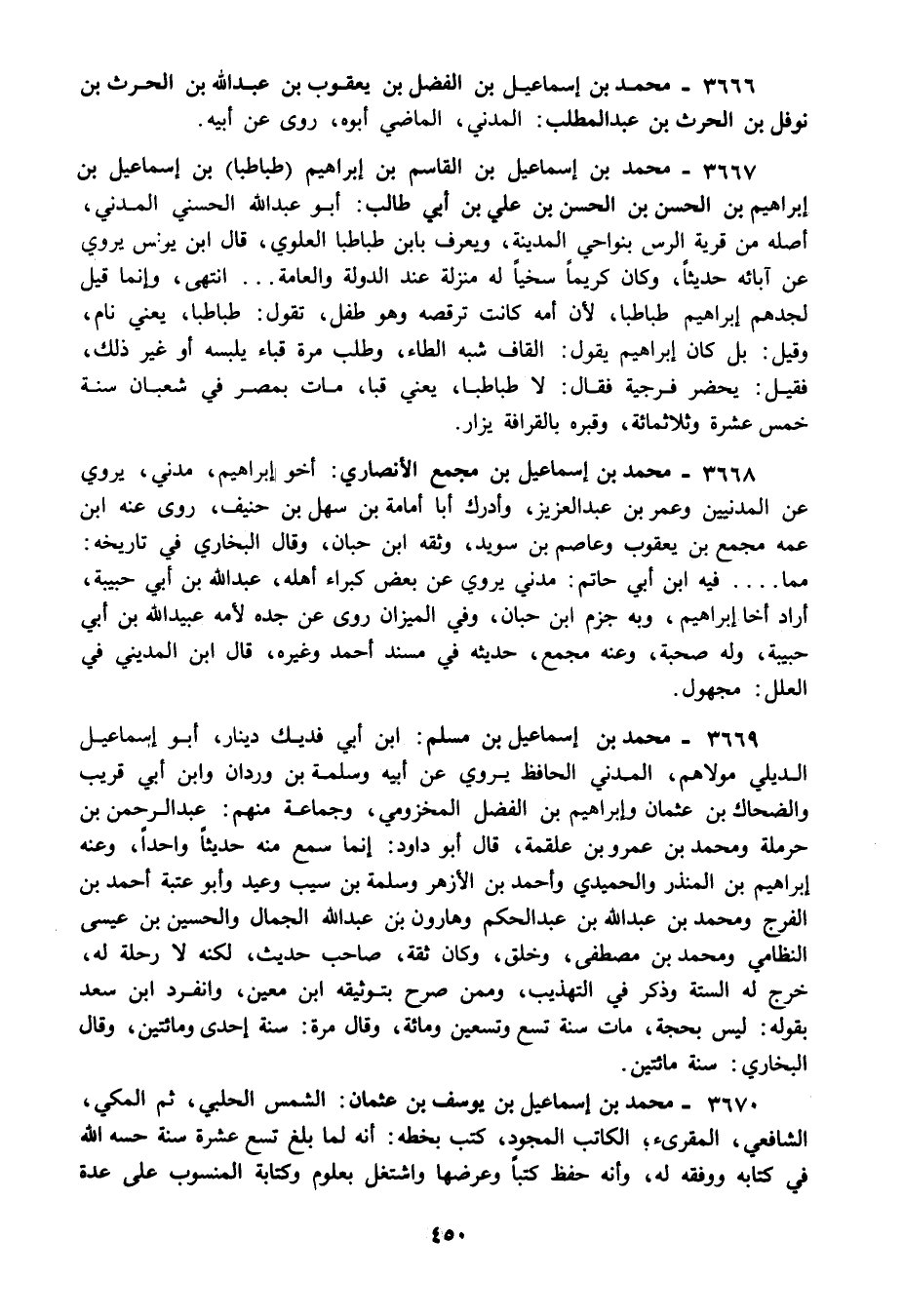 3666 - محمد بن إسماعيل بن الفضل بن يعقوب بن عبد الله بن الحرث بن نوفل بن الحرث بن عبد المطلب: المدني الماضي أبوه روى عن أبيه.