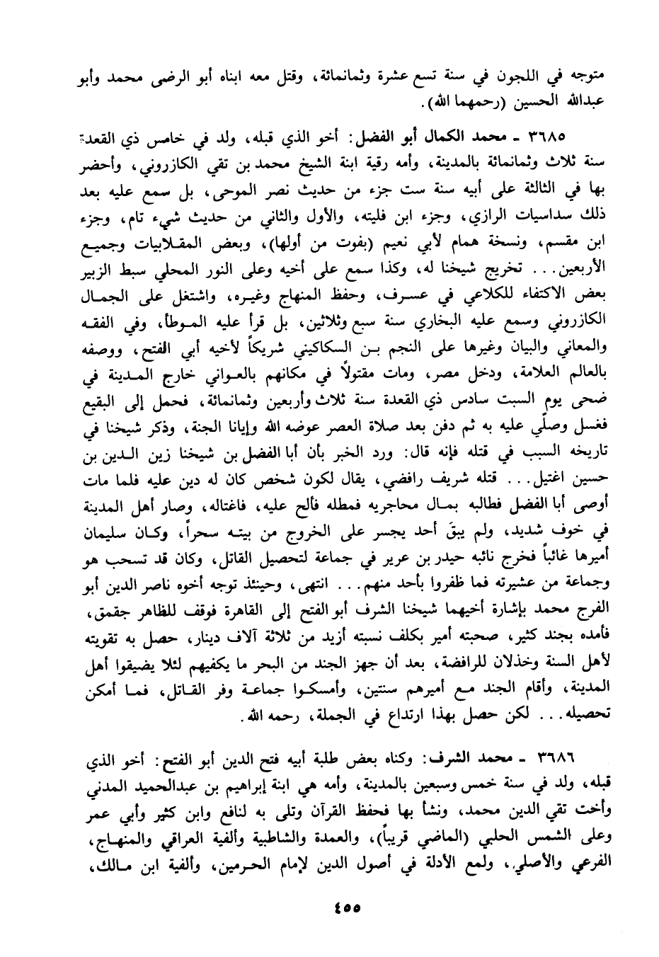 3685 - محمد الكمال أبو الفضل: أخو الذي قبله ولد في خامس ذي القعدة سنة ثلاث وثمانمائة بالمدينة وأمه رقية ابنة الشيخ محمد بن تقي الكازروني وأحضر بها في الثالثة على أبيه سنة ست جزء من حديث نصر الموحى بل سمع عليه بعد ذلك سداسيات الرازي وجزء ابن فليته والأول والثاني من حديث شيء تام وجزء ابن مقسم ونسخة همام لأبي نعيم "بفوت من أولها" وبعض المقلابيات وجميع الأربعين تخريج شيخنا له وكذا سمع على أخيه وعلى النور المحلي سبط الزبير بعض الاكتفاء للكلاعي في عسرف وحفظ المنهاج وغيره واشتغل على الجمال الكازروني وسمع عليه البخاري سنة سبع وثلاثين بل قرأ عليه الموطأ وفي الفقه والمعاني والبيان وغيرها على النجم بن السكاكيني شريكا لأخيه أبي الفتح ووصفه بالعالم العلامة ودخل مصر ومات مقتولا في مكانهم بالعواني خارج المدينة في ضحى يوم السبت سادس ذي القعدة سنة ثلاث وأربعين وثمانمائة فحمل إلى البقيع فغسل وصلي عليه به ثم دفن بعد صلاة العصر عوضه الله وإيانا الجنة وذكر شيخنا في تاريخه السبب في قتله فإنه قال: ورد الخبر بأن أبا الفضل بن شيخنا زين الدين بن حسين اغتيل قتله شريف رافضي يقال لكون شخص كان له دين عليه فلما مات أوصى أبا الفضل فطالبه بمال محاجريه فمطله فألح عليه فاغتاله وصار أهل المدينة في خوف شديد ولم يبق أحد يجسر على الخروج من بيته سحرا وكان سليمان أميرها غائبا فخرج نائبه حيدر بن عرير في جماعة لتحصيل القاتل وكان قد تسحب هو وجماعة من عشيرته فما ظفروا بأحد منهم انتهى وحينئذ توجه أخوه ناصر الدين أبو الفرج محمد بإشارة أخيهما شيخنا الشرف أبو الفتح إلى القاهرة فوقف للظاهر جقمق فأمده بجند كثير صحبته أمير بكلف نسبته أزيد من ثلاثة آلاف دينار حصل به تقويته لأهل السنة وخذلان للرافضة بعد أن جهز الجند من البحر ما يكفيهم لئلا يضيقوا أهل المدينة وأقام الجند مع أميرهم سنتين وأمسكوا جماعة وفر القاتل فما أمكن تحصيله لكن حصل بهذا ارتداع في الجملة رحمه الله.