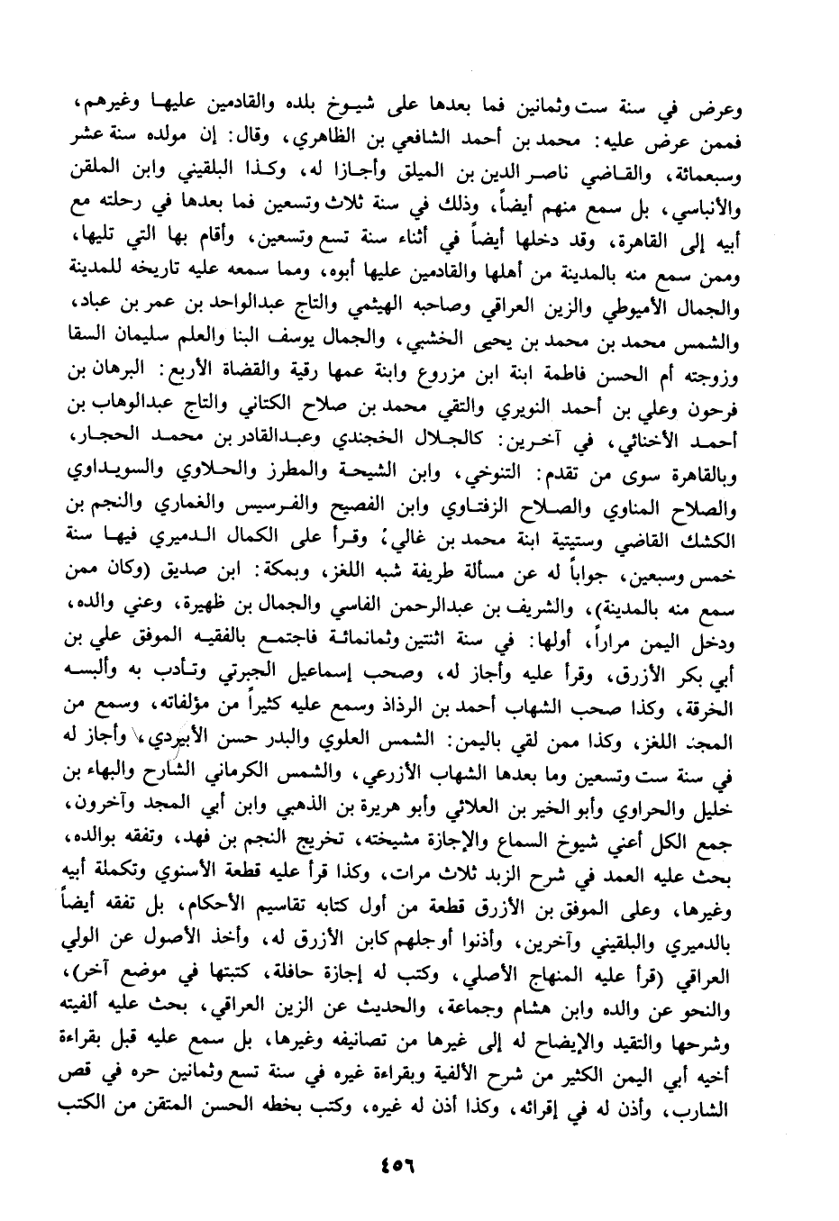 وعرض في سنة ست وثمانين فما بعدها على شيوخ بلده والقادمين عليها وغيرهم فممن عرض عليه: محمد بن أحمد الشافعي بن الظاهري وقال: إن مولده سنة عشر وسبعمائة والقاضي ناصر الدين بن الميلق وأجازا له وكذا البلقيني وابن الملقن والأنباسي بل سمع منهم أيضا وذلك في سنة ثلاث وتسعين فما بعدها في رحلته مع أبيه إلى القاهرة وقد دخلها أيضا في أثناء سنة تسع وتسعين وأقام بها التي تليها وممن سمع منه بالمدينة من أهلها والقادمين عليها أبوه ومما سمعه عليه تاريخه للمدينة والجمال الأميوطي والزين العراقي وصاحبه الهيثمي والتاج عبد الواحد بن عمر بن عباد والشمس محمد بن محمد بن يحيى الخشبي والجمال يوسف البنا والعلم سليمان السقا وزوجته أم الحسن فاطمة ابنة ابن مزروع وابنة عمها رقية والقضاة الأربع: البرهان بن فرحون وعلي بن أحمد النويري والتقي محمد بن صلاح الكتاني والتاج عبد الوهاب بن أحمد الأخنائي في آخرين كالجلال الخجندي وعبد القادر بن محمد الحجار وبالقاهرة سوى من تقدم: التنوخي وابن الشيحة والمطرز والحلاوي والسويداوي والصلاح المناوي والصلاح الزفتاوي وابن الفصيح والفرسيس والغماري والنجم بن الكشك القاضي وستيتية ابنة محمد بن غالي وقرأ على الكمال الدميري فيها سنة خمس وسبعين جوابا له عن مسألة طريفة شبه اللغز وبمكة: ابن صديق "وكان ممن سمع منه بالمدينة" والشريف بن عبد الرحمن الفاسي والجمال بن ظهيرة وعني والده ودخل اليمن مرارا أولها: في سنة اثنتين وثمانمائة فاجتمع بالفقيه الموفق علي بن أبي بكر الأزرق وقرأ عليه وأجاز له وصحب إسماعيل الجبرتي وتأدب به وألبسه الخرقة وكذا صحب الشهاب أحمد بن الرذاذ وسمع عليه كثيرا من مؤلفاته وسمع من المجد اللغز وكذا ممن لقي باليمن: الشمس العلوي والبدر حسن الأبيردي وأجاز له في سنة ست وتسعين وما بعدها الشهاب الأزرعي والشمس الكرماني الشارح والبهاء بن خليل والحراوي وابو الخير بن العلائي وابو هريرة بن الذهبي وابن أبي المجد وآخرون جمع الكل أعني شيوخ السماع والإجازة مشيخته تخريج النجم بن فهد وتفقه بوالده بحث عليه العمد في شرح الزبد ثلاث مرات وكذا قرأ عليه قطعة الأسنوي وتكملة أبيه وغيرها وعلى الموفق بن الأزرق قطعة من أول كتابه تقاسيم الأحكام بل تفقه أيضا بالدميري والبلقيني وآخرين وأذنوا أو جلهم كابن الأزرق له وأخذ الأصول عن الولي العراقي "قرأ عليه المنهاج الأصلي وكتب له إجازة حافلة كتبتها في موضع آخر" والنحو عن والده وابن هشام وجماعة والحديث عن الزين العراقي بحث عليه ألفيته وشرحها والتقيد والإيضاح له إلى غيرها من تصانيفه وغيرها بل سمع عليه قبل بقراءة أخيه أبي اليمن الكثير من شرح الألفية وبقراءة غيره في سنة تسع وثمانين حره في قص الشارب واذن له في إقرائه وكذا أذن له غيره وكتب بخطه الحسن المتقن من الكتب